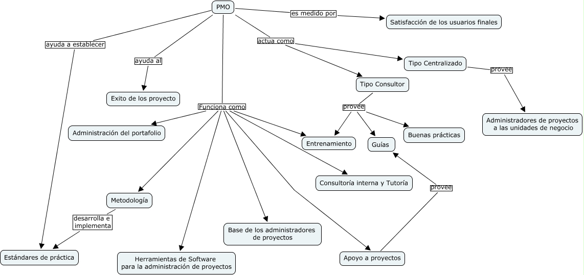Este Cmap, tiene información relacionada con: Why You Need a Project Management Office, PMO Funciona como Base de los administradores de proyectos, PMO Funciona como Herramientas de Software para la administración de proyectos, PMO ayuda al Exito de los proyecto, Tipo Consultor provee Guías, Tipo Consultor provee Buenas prácticas, PMO ayuda a establecer Estándares de práctica, PMO es medido por Satisfacción de los usuarios finales, PMO Funciona como Administración del portafolio, Tipo Centralizado provee Administradores de proyectos a las unidades de negocio, PMO Funciona como Apoyo a proyectos, Apoyo a proyectos provee Guías, PMO Funciona como Entrenamiento, Metodología desarrolla e implementa Estándares de práctica, Tipo Consultor provee Entrenamiento, PMO actua como Tipo Consultor, PMO Funciona como Metodología, PMO Funciona como Consultoría interna y Tutoría, PMO actua como Tipo Centralizado