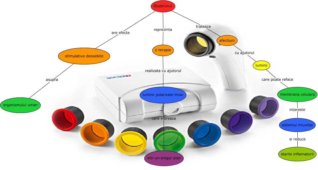 This Concept Map, created with IHMC CmapTools, has information related to: Bioptronul, Bioptronul reprezinta o terapie, afectiuni cu ajutorul luminii, membrana celulara intareste sistemul imunitar, luminii care poate reface membrana celulara, Bioptronul trateaza afectiuni, stimulative deosebite asupra organismului uman, Bioptronul are efecte stimulative deosebite, o terapie realizata cu ajutorul luminii polarizate liniar, sistemul imunitar si reduce starile inflamatorii, luminii polarizate liniar care vibreaza intr-un singur plan