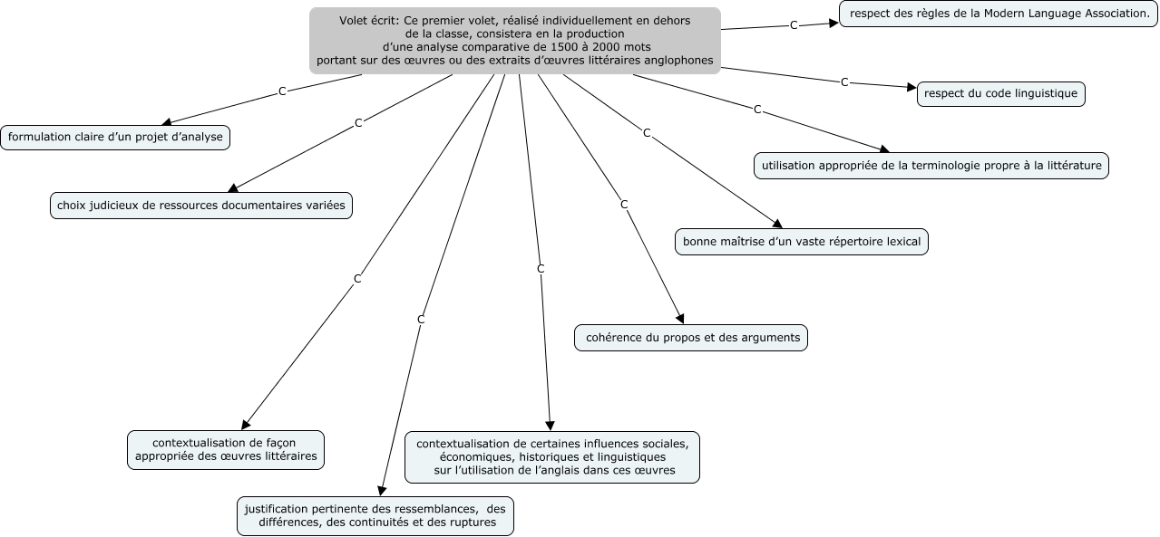 Cette carte de concepts créée avec IHMC CmapTools traite de: Volet Écrit, Volet écrit: Ce premier volet, réalisé individuellement en dehors de la classe, consistera en la production d’une analyse comparative de 1500 à 2000 mots portant sur des œuvres ou des extraits d’œuvres littéraires anglophones C cohérence du propos et des arguments, Volet écrit: Ce premier volet, réalisé individuellement en dehors de la classe, consistera en la production d’une analyse comparative de 1500 à 2000 mots portant sur des œuvres ou des extraits d’œuvres littéraires anglophones C respect du code linguistique, Volet écrit: Ce premier volet, réalisé individuellement en dehors de la classe, consistera en la production d’une analyse comparative de 1500 à 2000 mots portant sur des œuvres ou des extraits d’œuvres littéraires anglophones C contextualisation de certaines influences sociales, économiques, historiques et linguistiques sur l’utilisation de l’anglais dans ces œuvres, Volet écrit: Ce premier volet, réalisé individuellement en dehors de la classe, consistera en la production d’une analyse comparative de 1500 à 2000 mots portant sur des œuvres ou des extraits d’œuvres littéraires anglophones C utilisation appropriée de la terminologie propre à la littérature, Volet écrit: Ce premier volet, réalisé individuellement en dehors de la classe, consistera en la production d’une analyse comparative de 1500 à 2000 mots portant sur des œuvres ou des extraits d’œuvres littéraires anglophones C justification pertinente des ressemblances, des différences, des continuités et des ruptures, Volet écrit: Ce premier volet, réalisé individuellement en dehors de la classe, consistera en la production d’une analyse comparative de 1500 à 2000 mots portant sur des œuvres ou des extraits d’œuvres littéraires anglophones C bonne maîtrise d’un vaste répertoire lexical, Volet écrit: Ce premier volet, réalisé individuellement en dehors de la classe, consistera en la production d’une analyse comparative de 1500 à 2000 mots portant sur des œuvres ou des extraits d’œuvres littéraires anglophones C choix judicieux de ressources documentaires variées, Volet écrit: Ce premier volet, réalisé individuellement en dehors de la classe, consistera en la production d’une analyse comparative de 1500 à 2000 mots portant sur des œuvres ou des extraits d’œuvres littéraires anglophones C formulation claire d’un projet d’analyse, Volet écrit: Ce premier volet, réalisé individuellement en dehors de la classe, consistera en la production d’une analyse comparative de 1500 à 2000 mots portant sur des œuvres ou des extraits d’œuvres littéraires anglophones C respect des règles de la Modern Language Association., Volet écrit: Ce premier volet, réalisé individuellement en dehors de la classe, consistera en la production d’une analyse comparative de 1500 à 2000 mots portant sur des œuvres ou des extraits d’œuvres littéraires anglophones C contextualisation de façon appropriée des œuvres littéraires