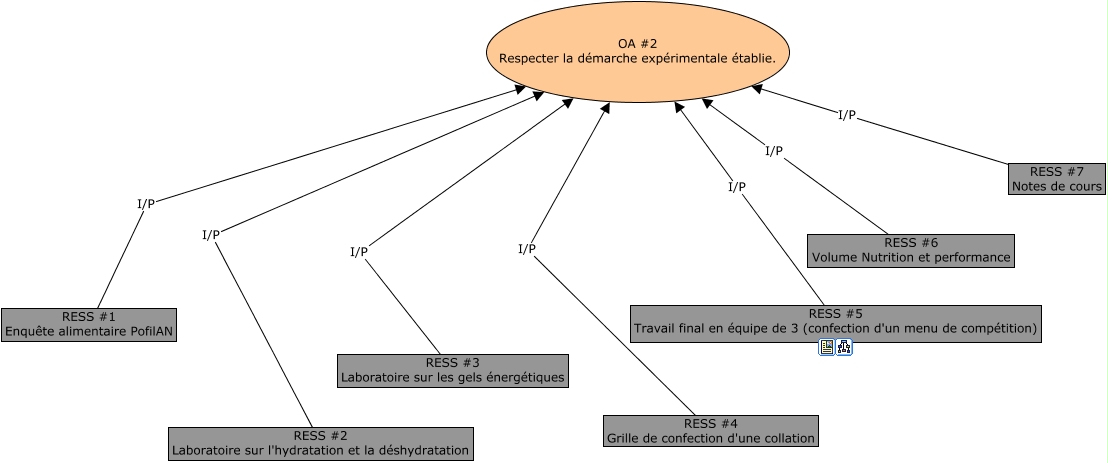 Cette carte de concepts créée avec IHMC CmapTools traite de: OA 2, RESS #2 Laboratoire sur l'hydratation et la déshydratation I/P OA #2 Respecter la démarche expérimentale établie., RESS #5 Travail final en équipe de 3 (confection d'un menu de compétition) I/P OA #2 Respecter la démarche expérimentale établie., RESS #7 Notes de cours I/P OA #2 Respecter la démarche expérimentale établie., RESS #3 Laboratoire sur les gels énergétiques I/P OA #2 Respecter la démarche expérimentale établie., RESS #1 Enquête alimentaire PofilAN I/P OA #2 Respecter la démarche expérimentale établie., RESS #6 Volume Nutrition et performance I/P OA #2 Respecter la démarche expérimentale établie., RESS #4 Grille de confection d'une collation I/P OA #2 Respecter la démarche expérimentale établie.