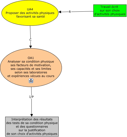 This Concept Map, created with IHMC CmapTools, has information related to: UA4, Travail écrit sur son choix d'activités physiques R UA4 Proposer des activités physiques favorisant sa santé, OA1 Analyser sa condition physique ses facteurs de motivation, ses capacités et ses limites selon ses laboratoires et expériences vécues au cours I/P Interprétation des résultats des tests de sa condition physique et des questionnaires sur la justification de son choix d'activités physiques, UA4 Proposer des activités physiques favorisant sa santé C OA1 Analyser sa condition physique ses facteurs de motivation, ses capacités et ses limites selon ses laboratoires et expériences vécues au cours