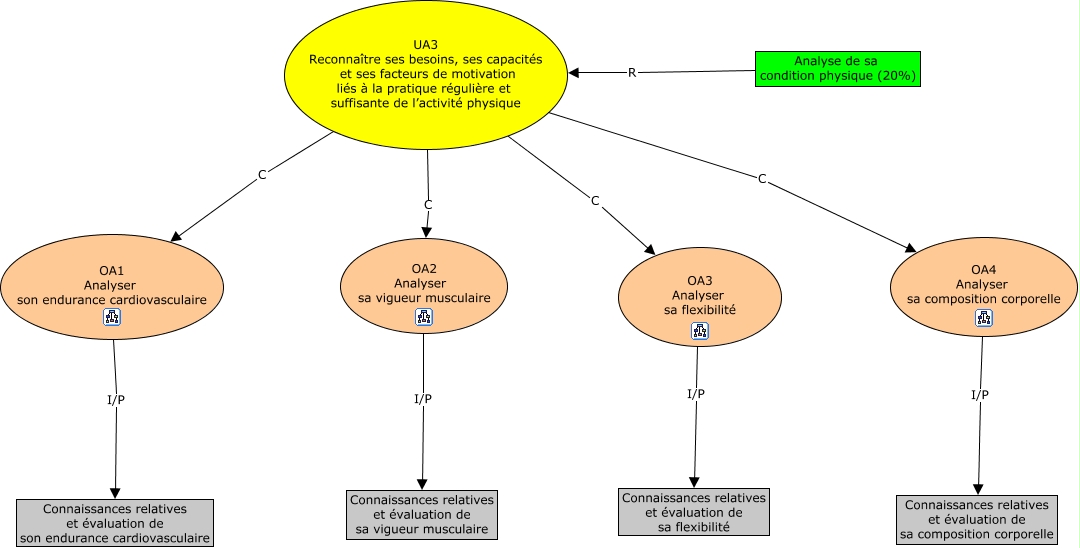 This Concept Map, created with IHMC CmapTools, has information related to: UA3, UA3 Reconnaître ses besoins, ses capacités et ses facteurs de motivation liés à la pratique régulière et suffisante de l’activité physique C OA2 Analyser sa vigueur musculaire, OA3 Analyser sa flexibilité I/P Connaissances relatives et évaluation de sa flexibilité, UA3 Reconnaître ses besoins, ses capacités et ses facteurs de motivation liés à la pratique régulière et suffisante de l’activité physique C OA1 Analyser son endurance cardiovasculaire, UA3 Reconnaître ses besoins, ses capacités et ses facteurs de motivation liés à la pratique régulière et suffisante de l’activité physique C OA4 Analyser sa composition corporelle, OA4 Analyser sa composition corporelle I/P Connaissances relatives et évaluation de sa composition corporelle, Analyse de sa condition physique (20%) R UA3 Reconnaître ses besoins, ses capacités et ses facteurs de motivation liés à la pratique régulière et suffisante de l’activité physique, OA2 Analyser sa vigueur musculaire I/P Connaissances relatives et évaluation de sa vigueur musculaire, OA1 Analyser son endurance cardiovasculaire I/P Connaissances relatives et évaluation de son endurance cardiovasculaire, UA3 Reconnaître ses besoins, ses capacités et ses facteurs de motivation liés à la pratique régulière et suffisante de l’activité physique C OA3 Analyser sa flexibilité