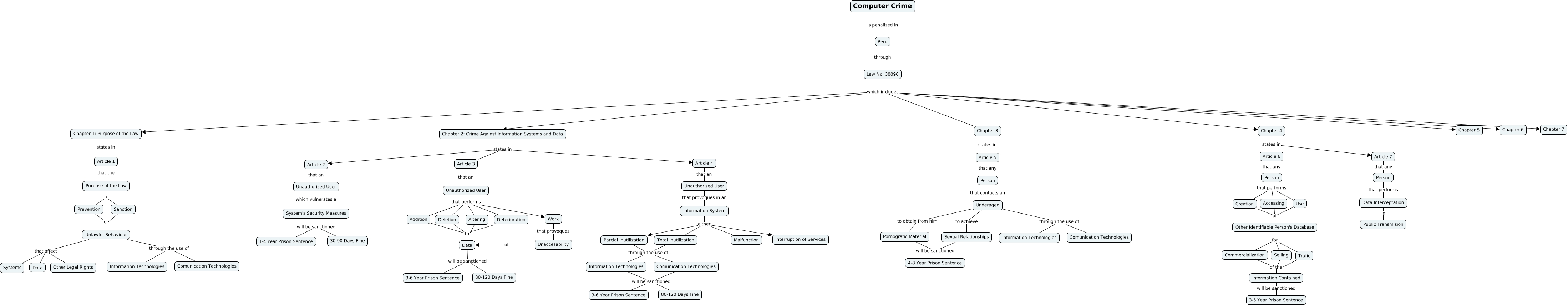 This Concept Map, created with IHMC CmapTools, has information related to: Activity 4 - Computer Crime, Person that performs Use, Underaged through the use of Information Technologies, Unauthorized User that performs Deterioration, Information System either Total Inutilization, Chapter 2: Crime Against Information Systems and Data states in Article 2, Article 3 that an Unauthorized User, Law No. 30096 which includes Chapter 3, Deterioration to Data, Article 5 that any Person, System's Security Measures will be sanctioned 1-4 Year Prison Sentence, Purpose of the Law is Sanction, Unlawful Behaviour that affect Systems, Data Interceptation in Public Transmision, Underaged to achieve Sexual Relationships, Unlawful Behaviour through the use of Comunication Technologies, Chapter 4 states in Article 6, Computer Crime is penalized in Peru, Commercialization of the Information Contained, Information System either Interruption of Services, Parcial Inutilization through the use of Comunication Technologies