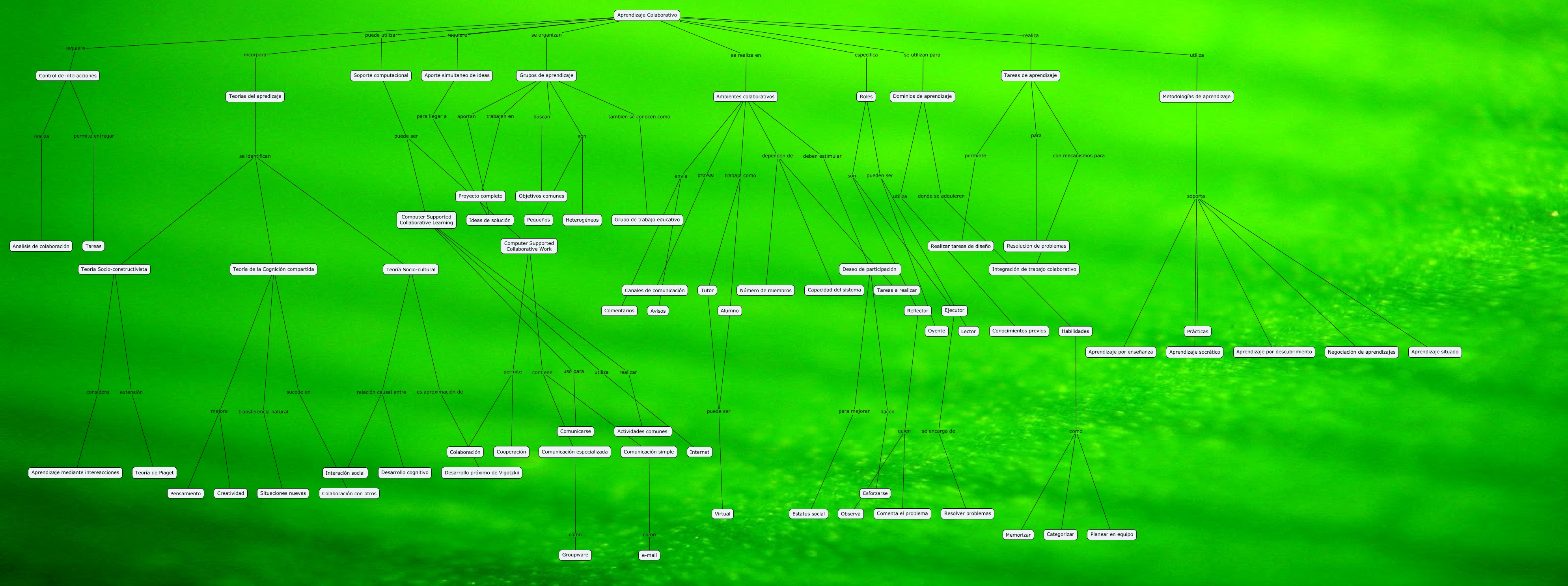 Este Cmap, tiene información relacionada con: Aprendizaje Colaborativo, Ambientes colaborativos envía Comentarios, Dominios de aprendizaje utiliza Conocimientos previos, Computer Supported Collaborative Learning uso para Comunicarse, Metodologías de aprendizaje soporta Aprendizaje socrático, Aprendizaje Colaborativo se realiza en Ambientes colaborativos, Tareas de aprendizaje con mecanismos para Integración de trabajo colaborativo, Tutor puede ser Virtual, Computer Supported Collaborative Work contiene Comunicación especializada, Aprendizaje Colaborativo requiere Aporte simultaneo de ideas, Ambientes colaborativos trabaja como Tutor, Teorias del apredizaje se identifican Teoria Socio-constructivista, Teoría de la Cognición compartida mejora Pensamiento, Teoría de la Cognición compartida sucede en Colaboración con otros, Comunicación especializada como Groupware, Control de interacciones realiza Analisis de colaboración, Aporte simultaneo de ideas para llegar a Ideas de solución, Roles son Ejecutor, Computer Supported Collaborative Work permite Colaboración, Teoría Socio-cultural relación causal entre Interación social, Roles pueden ser Oyente