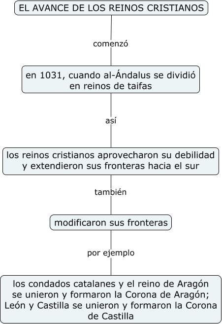 Este Cmap, tiene información relacionada con: El avance de los reinos cristianos, modificaron sus fronteras por ejemplo los condados catalanes y el reino de Aragón se unieron y formaron la Corona de Aragón; León y Castilla se unieron y formaron la Corona de Castilla, EL AVANCE DE LOS REINOS CRISTIANOS comenzó en 1031, cuando al-Ándalus se dividió en reinos de taifas, los reinos cristianos aprovecharon su debilidad y extendieron sus fronteras hacia el sur también modificaron sus fronteras, en 1031, cuando al-Ándalus se dividió en reinos de taifas así los reinos cristianos aprovecharon su debilidad y extendieron sus fronteras hacia el sur