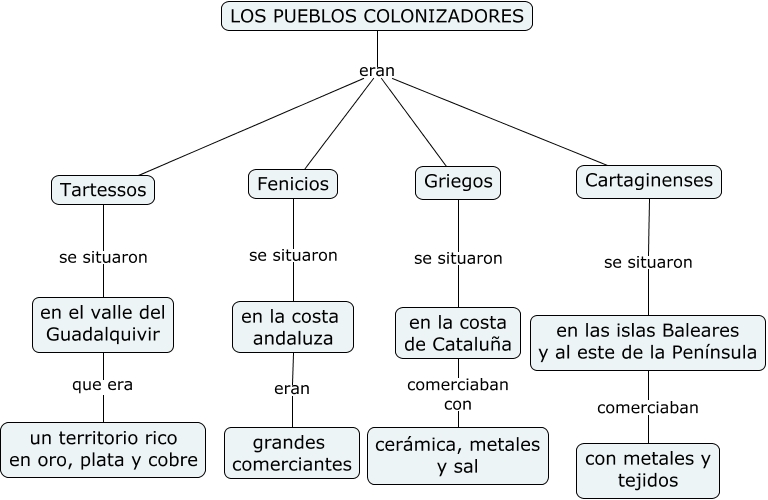 Este Cmap, tiene información relacionada con: Los pueblos colonizadores, Fenicios se situaron en la costa andaluza, en el valle del Guadalquivir que era un territorio rico en oro, plata y cobre, LOS PUEBLOS COLONIZADORES eran Cartaginenses, LOS PUEBLOS COLONIZADORES eran Tartessos, LOS PUEBLOS COLONIZADORES eran Fenicios, LOS PUEBLOS COLONIZADORES eran Griegos, en las islas Baleares y al este de la Península comerciaban con metales y tejidos, Griegos se situaron en la costa de Cataluña, Cartaginenses se situaron en las islas Baleares y al este de la Península, Tartessos se situaron en el valle del Guadalquivir, en la costa de Cataluña comerciaban con cerámica, metales y sal, en la costa andaluza eran grandes comerciantes