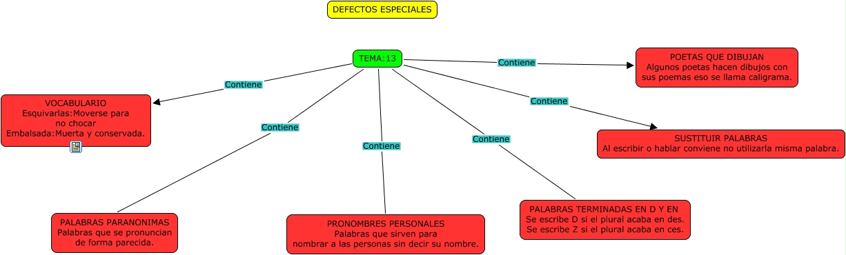 Este Cmap, tiene información relacionada con: LENGUA, TEMA:13 Contiene POETAS QUE DIBUJAN Algunos poetas hacen dibujos con sus poemas eso se llama caligrama., TEMA:13 Contiene PALABRAS PARANONIMAS Palabras que se pronuncian de forma parecida., TEMA:13 Contiene SUSTITUIR PALABRAS Al escribir o hablar conviene no utilizarla misma palabra., TEMA:13 Contiene PALABRAS TERMINADAS EN D Y EN Se escribe D si el plural acaba en des. Se escribe Z si el plural acaba en ces., TEMA:13 Contiene PRONOMBRES PERSONALES Palabras que sirven para nombrar a las personas sin decir su nombre., TEMA:13 Contiene VOCABULARIO Esquivarlas:Moverse para no chocar Embalsada:Muerta y conservada.