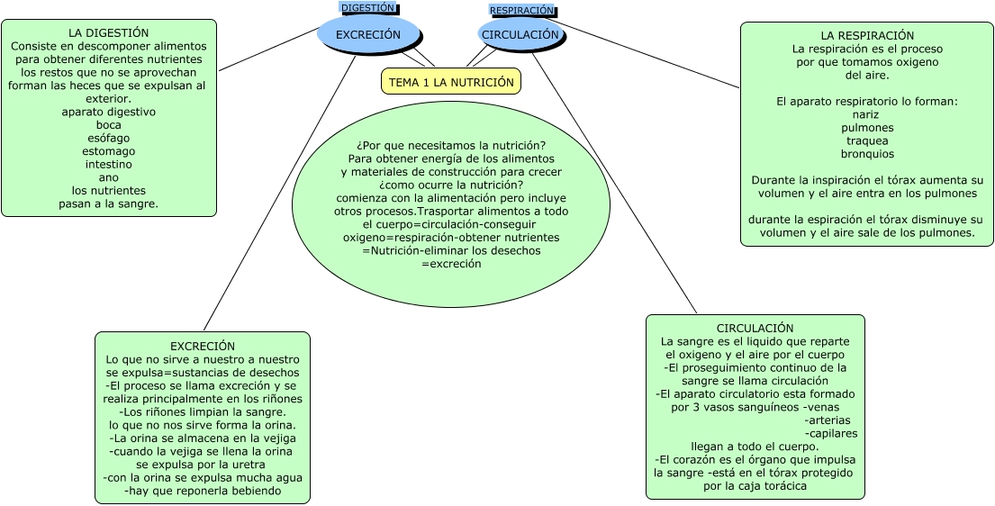 Este Cmap, tiene información relacionada con: la nutrición.cmap.cmap, TEMA 1 LA NUTRICIÓN EXCRECIÓN EXCRECIÓN Lo que no sirve a nuestro a nuestro se expulsa=sustancias de desechos -El proceso se llama excreción y se realiza principalmente en los riñones -Los riñones limpian la sangre. lo que no nos sirve forma la orina. -La orina se almacena en la vejiga -cuando la vejiga se llena la orina se expulsa por la uretra -con la orina se expulsa mucha agua -hay que reponerla bebiendo, TEMA 1 LA NUTRICIÓN DIGESTIÓN LA DIGESTIÓN Consiste en descomponer alimentos para obtener diferentes nutrientes los restos que no se aprovechan forman las heces que se expulsan al exterior. aparato digestivo boca esófago estomago intestino ano los nutrientes pasan a la sangre., TEMA 1 LA NUTRICIÓN CIRCULACIÓN CIRCULACIÓN La sangre es el liquido que reparte el oxigeno y el aire por el cuerpo -El proseguimiento continuo de la sangre se llama circulación -El aparato circulatorio esta formado por 3 vasos sanguíneos -venas -arterias -capilares llegan a todo el cuerpo. -El corazón es el órgano que impulsa la sangre -está en el tórax protegido por la caja torácica, TEMA 1 LA NUTRICIÓN RESPIRACIÓN LA RESPIRACIÓN La respiración es el proceso por que tomamos oxigeno del aire. El aparato respiratorio lo forman: nariz pulmones traquea bronquios Durante la inspiración el tórax aumenta su volumen y el aire entra en los pulmones durante la espiración el tórax disminuye su volumen y el aire sale de los pulmones.