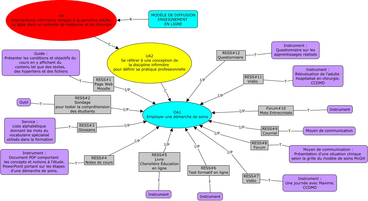 Cette carte de concepts créée avec IHMC CmapTools traite de: Schéma du déroulement, RESS#11 Vidéo T Instrument : Réévaluation de l'adulte hospitalisé en chirurgie. CCDMD, UA2 Se référer à une conception de la discipline infirmière pour définir sa pratique professionnelle C OA1 Employer une démarche de soins, RESS#7 Vidéo T Instrument : Une journée avec Maxime. CCDMD, RESS#5 Livre Chenelière Éducation en ligne T Instrument, RESS#12 Questionnaire I/P OA1 Employer une démarche de soins, MODÈLE DE DIFFUSION ENSEIGNEMENT EN LIGNE R SA Interventions infirmières simples à la personne adulte ou âgée dans un contexte de médecine et de chirurgie, RESS#9 Courriel T Moyen de communication, Forum#10 Mots Entrecroisés T Instrument, RESS#6 Test formatif en ligne T Instrument, RESS#8 Forum T Moyen de communication : Présentation d'une situation clinique selon la grille du modèle de soins McGill, SA Interventions infirmières simples à la personne adulte ou âgée dans un contexte de médecine et de chirurgie C UA2 Se référer à une conception de la discipline infirmière pour définir sa pratique professionnelle, RESS#12 Questionnaire T Instrument : Questionnaire sur les apprentissages réalisés, RESS#3 Glossaire T Service : Liste alphabétique donnant les mots du vocabulaire spécialisé utilisés dans la formation, RESS#1 Page Web Moodle T Guide : Présenter les conditions et objectifs du cours en y affichant du contenu tel que des textes, des hyperliens et des fichiers, RESS#2 Sondage pour tester la compréhension des étudiants T Outil, RESS#4 Notes de cours T Instrument : Document PDF comportant les concepts et notions à l'étude. PowerPoint portant sur les étapes d'une démarche de soins., RESS#11 Vidéo I/P OA1 Employer une démarche de soins