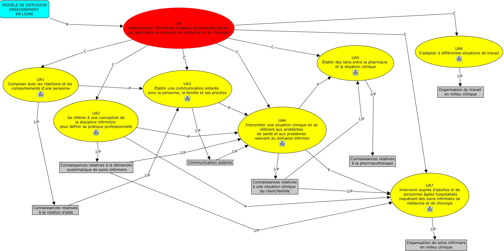 Cette carte de concepts créée avec IHMC CmapTools traite de: SA, SA Interventions infirmières simples à la personne adulte ou âgée dans un contexte de médecine et de chirurgie C UA5 Établir des liens entre la pharmacie et la situation clinique, Connaissances relatives à la démarche systématique de soins infirmiers I/P UA7 Intervenir auprès d'adultes et de personnes âgées hospitalisés requérant des soins infirmiers de médecine et de chirurgie, SA Interventions infirmières simples à la personne adulte ou âgée dans un contexte de médecine et de chirurgie C UA6 S'adapter à différentes situations de travail, UA3 Établir une communication aidante avec la personne, la famille et ses proches P UA4 Interpréter une situation clinique en se référant aux problèmes de santé et aux problèmes relevant du domaine infirmier, UA4 Interpréter une situation clinique en se référant aux problèmes de santé et aux problèmes relevant du domaine infirmier P UA7 Intervenir auprès d'adultes et de personnes âgées hospitalisés requérant des soins infirmiers de médecine et de chirurgie, Connaissances relatives à une situation clinique du client/famille I/P UA5 Établir des liens entre la pharmacie et la situation clinique, UA4 Interpréter une situation clinique en se référant aux problèmes de santé et aux problèmes relevant du domaine infirmier I/P Connaissances relatives à une situation clinique du client/famille, UA1 Composer avec les réactions et les comportements d'une personne P UA3 Établir une communication aidante avec la personne, la famille et ses proches, UA6 S'adapter à différentes situations de travail I/P Organisation du travail en milieu clinique, UA7 Intervenir auprès d'adultes et de personnes âgées hospitalisés requérant des soins infirmiers de médecine et de chirurgie I/P Dispensation de soins infirmiers en milieu clinique, SA Interventions infirmières simples à la personne adulte ou âgée dans un contexte de médecine et de chirurgie C UA3 Établir une communication aidante avec la personne, la famille et ses proches, Connaissances relatives à une situation clinique du client/famille I/P UA7 Intervenir auprès d'adultes et de personnes âgées hospitalisés requérant des soins infirmiers de médecine et de chirurgie, SA Interventions infirmières simples à la personne adulte ou âgée dans un contexte de médecine et de chirurgie C UA2 Se référer à une conception de la discipline infirmière pour définir sa pratique professionnelle, UA2 Se référer à une conception de la discipline infirmière pour définir sa pratique professionnelle I/P Connaissances relatives à la démarche systématique de soins infirmiers, MODÈLE DE DIFFUSION ENSEIGNEMENT EN LIGNE R SA Interventions infirmières simples à la personne adulte ou âgée dans un contexte de médecine et de chirurgie, UA3 Établir une communication aidante avec la personne, la famille et ses proches I/P Communication aidante, Connaissances relatives à la relation d'aide I/P UA3 Établir une communication aidante avec la personne, la famille et ses proches, Connaissances relatives à la démarche systématique de soins infirmiers I/P UA4 Interpréter une situation clinique en se référant aux problèmes de santé et aux problèmes relevant du domaine infirmier, UA1 Composer avec les réactions et les comportements d'une personne I/P Connaissances relatives à la relation d'aide, UA4 Interpréter une situation clinique en se référant aux problèmes de santé et aux problèmes relevant du domaine infirmier P UA5 Établir des liens entre la pharmacie et la situation clinique