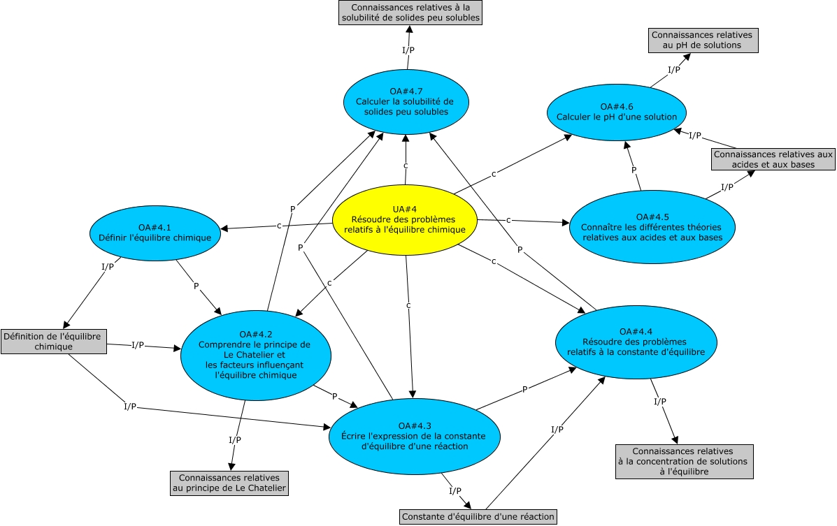 Cette carte de concepts créée avec IHMC CmapTools traite de: UA4, UA#4 Résoudre des problèmes relatifs à l'équilibre chimique c OA#4.5 Connaître les différentes théories relatives aux acides et aux bases, Définition de l'équilibre chimique I/P OA#4.3 Écrire l'expression de la constante d'équilibre d'une réaction, Connaissances relatives aux acides et aux bases I/P OA#4.6 Calculer le pH d'une solution, OA#4.2 Comprendre le principe de Le Chatelier et les facteurs influençant l'équilibre chimique I/P Connaissances relatives au principe de Le Chatelier, OA#4.2 Comprendre le principe de Le Chatelier et les facteurs influençant l'équilibre chimique P OA#4.3 Écrire l'expression de la constante d'équilibre d'une réaction, OA#4.4 Résoudre des problèmes relatifs à la constante d'équilibre I/P Connaissances relatives à la concentration de solutions à l'équilibre, UA#4 Résoudre des problèmes relatifs à l'équilibre chimique c OA#4.2 Comprendre le principe de Le Chatelier et les facteurs influençant l'équilibre chimique, OA#4.5 Connaître les différentes théories relatives aux acides et aux bases P OA#4.6 Calculer le pH d'une solution, Constante d'équilibre d'une réaction I/P OA#4.4 Résoudre des problèmes relatifs à la constante d'équilibre, OA#4.2 Comprendre le principe de Le Chatelier et les facteurs influençant l'équilibre chimique P OA#4.7 Calculer la solubilité de solides peu solubles, OA#4.3 Écrire l'expression de la constante d'équilibre d'une réaction P OA#4.7 Calculer la solubilité de solides peu solubles, UA#4 Résoudre des problèmes relatifs à l'équilibre chimique c OA#4.6 Calculer le pH d'une solution, UA#4 Résoudre des problèmes relatifs à l'équilibre chimique c OA#4.4 Résoudre des problèmes relatifs à la constante d'équilibre, OA#4.6 Calculer le pH d'une solution I/P Connaissances relatives au pH de solutions, OA#4.5 Connaître les différentes théories relatives aux acides et aux bases I/P Connaissances relatives aux acides et aux bases, OA#4.4 Résoudre des problèmes relatifs à la constante d'équilibre P OA#4.7 Calculer la solubilité de solides peu solubles, UA#4 Résoudre des problèmes relatifs à l'équilibre chimique c OA#4.1 Définir l'équilibre chimique, UA#4 Résoudre des problèmes relatifs à l'équilibre chimique c OA#4.7 Calculer la solubilité de solides peu solubles, OA#4.3 Écrire l'expression de la constante d'équilibre d'une réaction I/P Constante d'équilibre d'une réaction, OA#4.7 Calculer la solubilité de solides peu solubles I/P Connaissances relatives à la solubilité de solides peu solubles