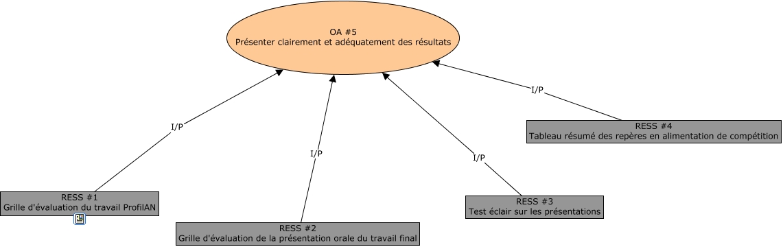 Cette carte de concepts créée avec IHMC CmapTools traite de: OA 5, RESS #3 Test éclair sur les présentations I/P OA #5 Présenter clairement et adéquatement des résultats, RESS #4 Tableau résumé des repères en alimentation de compétition I/P OA #5 Présenter clairement et adéquatement des résultats, RESS #1 Grille d'évaluation du travail ProfilAN I/P OA #5 Présenter clairement et adéquatement des résultats, RESS #2 Grille d'évaluation de la présentation orale du travail final I/P OA #5 Présenter clairement et adéquatement des résultats