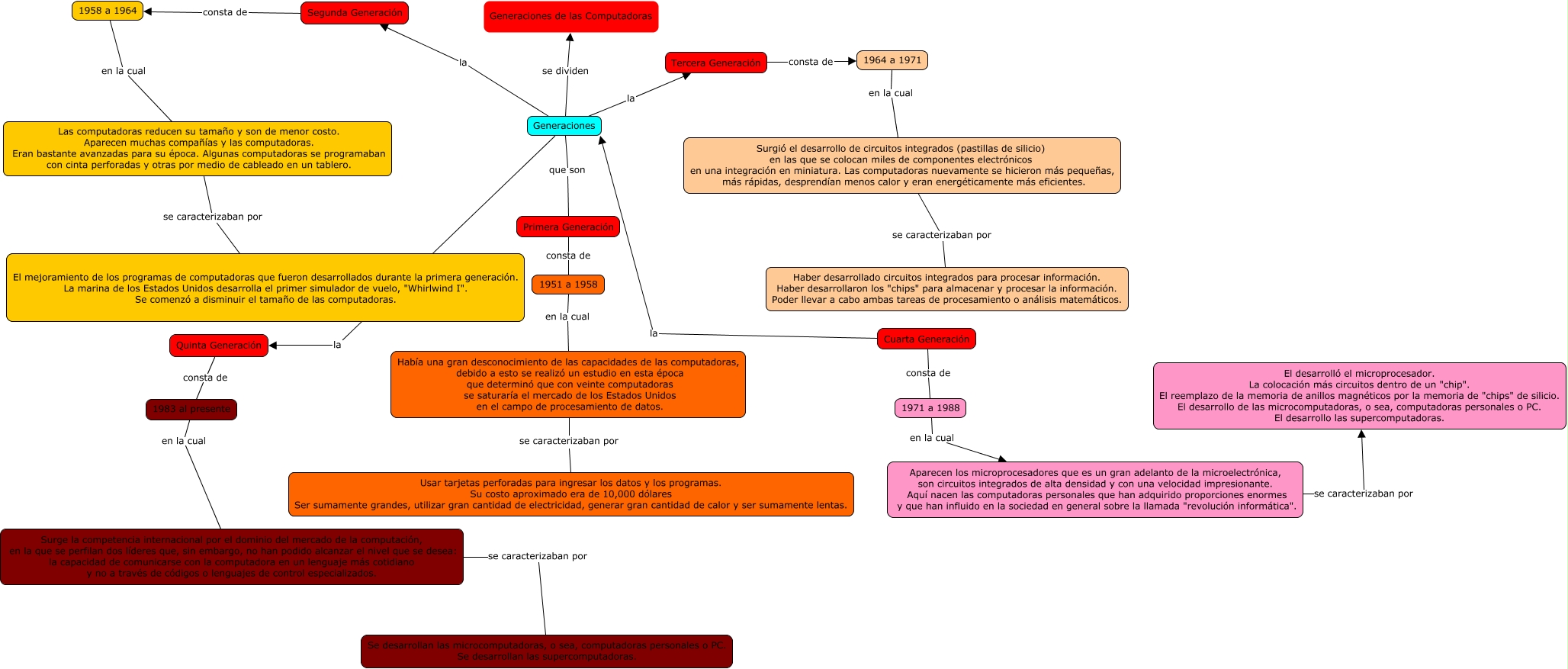 Este Cmap, tiene información relacionada con: Generaciones de las Computadoras Ian Carlos Moreno, Las computadoras reducen su tamaño y son de menor costo. Aparecen muchas compañías y las computadoras. Eran bastante avanzadas para su época. Algunas computadoras se programaban con cinta perforadas y otras por medio de cableado en un tablero. se caracterizaban por El mejoramiento de los programas de computadoras que fueron desarrollados durante la primera generación. La marina de los Estados Unidos desarrolla el primer simulador de vuelo, "Whirlwind I". Se comenzó a disminuir el tamaño de las computadoras., Tercera Generación consta de 1964 a 1971, Cuarta Generación la Generaciones, Generaciones la Segunda Generación, Cuarta Generación consta de 1971 a 1988, Surgió el desarrollo de circuitos integrados (pastillas de silicio) en las que se colocan miles de componentes electrónicos en una integración en miniatura. Las computadoras nuevamente se hicieron más pequeñas, más rápidas, desprendían menos calor y eran energéticamente más eficientes. se caracterizaban por Haber desarrollado circuitos integrados para procesar información. Haber desarrollaron los "chips" para almacenar y procesar la información. Poder llevar a cabo ambas tareas de procesamiento o análisis matemáticos., Quinta Generación consta de 1983 al presente, 1964 a 1971 en la cual Surgió el desarrollo de circuitos integrados (pastillas de silicio) en las que se colocan miles de componentes electrónicos en una integración en miniatura. Las computadoras nuevamente se hicieron más pequeñas, más rápidas, desprendían menos calor y eran energéticamente más eficientes., 1983 al presente en la cual Surge la competencia internacional por el dominio del mercado de la computación, en la que se perfilan dos líderes que, sin embargo, no han podido alcanzar el nivel que se desea: la capacidad de comunicarse con la computadora en un lenguaje más cotidiano y no a través de códigos o lenguajes de control especializados., Surge la competencia internacional por el dominio del mercado de la computación, en la que se perfilan dos líderes que, sin embargo, no han podido alcanzar el nivel que se desea: la capacidad de comunicarse con la computadora en un lenguaje más cotidiano y no a través de códigos o lenguajes de control especializados. se caracterizaban por Se desarrollan las microcomputadoras, o sea, computadoras personales o PC. Se desarrollan las supercomputadoras., Generaciones se dividen Generaciones de las Computadoras, 1958 a 1964 en la cual Las computadoras reducen su tamaño y son de menor costo. Aparecen muchas compañías y las computadoras. Eran bastante avanzadas para su época. Algunas computadoras se programaban con cinta perforadas y otras por medio de cableado en un tablero., Generaciones la Quinta Generación, 1971 a 1988 en la cual Aparecen los microprocesadores que es un gran adelanto de la microelectrónica, son circuitos integrados de alta densidad y con una velocidad impresionante. Aquí nacen las computadoras personales que han adquirido proporciones enormes y que han influido en la sociedad en general sobre la llamada "revolución informática"., Generaciones que son Primera Generación, Generaciones la Tercera Generación, Había una gran desconocimiento de las capacidades de las computadoras, debido a esto se realizó un estudio en esta época que determinó que con veinte computadoras se saturaría el mercado de los Estados Unidos en el campo de procesamiento de datos. se caracterizaban por Usar tarjetas perforadas para ingresar los datos y los programas. Su costo aproximado era de 10,000 dólares Ser sumamente grandes, utilizar gran cantidad de electricidad, generar gran cantidad de calor y ser sumamente lentas., 1951 a 1958 en la cual Había una gran desconocimiento de las capacidades de las computadoras, debido a esto se realizó un estudio en esta época que determinó que con veinte computadoras se saturaría el mercado de los Estados Unidos en el campo de procesamiento de datos., Segunda Generación consta de 1958 a 1964, Aparecen los microprocesadores que es un gran adelanto de la microelectrónica, son circuitos integrados de alta densidad y con una velocidad impresionante. Aquí nacen las computadoras personales que han adquirido proporciones enormes y que han influido en la sociedad en general sobre la llamada "revolución informática". se caracterizaban por El desarrolló el microprocesador. La colocación más circuitos dentro de un "chip". El reemplazo de la memoria de anillos magnéticos por la memoria de "chips" de silicio. El desarrollo de las microcomputadoras, o sea, computadoras personales o PC. El desarrollo las supercomputadoras.