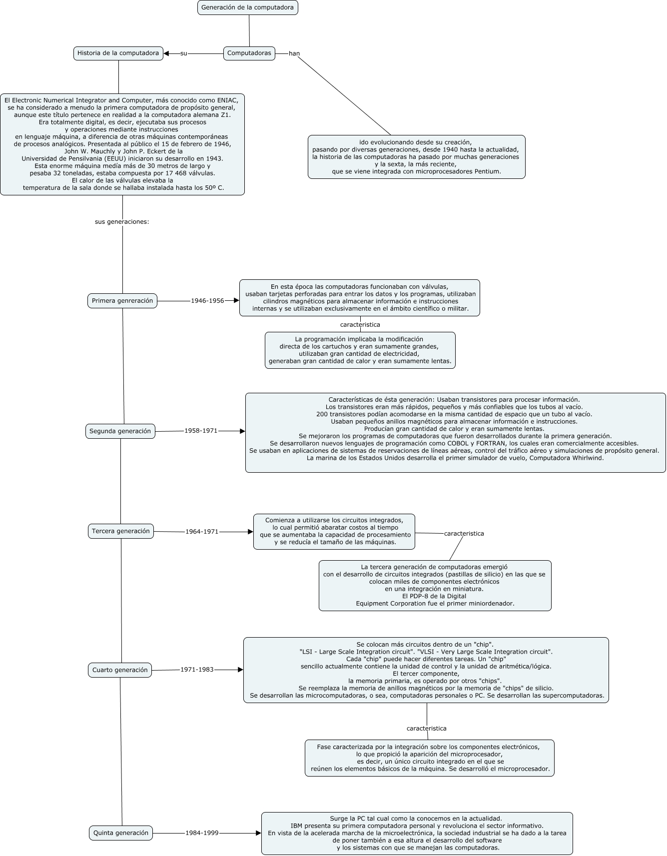 此概念图�?IHMC CmapTools 创建, 内含信息有关�? generacion de computadora, Tercera generación 1964-1971 Comienza a utilizarse los circuitos integrados, lo cual permitió abaratar costos al tiempo que se aumentaba la capacidad de procesamiento y se reducía el tamaño de las máquinas., Computadoras han ido evolucionando desde su creación, pasando por diversas generaciones, desde 1940 hasta la actualidad, la historia de las computadoras ha pasado por muchas generaciones y la sexta, la más reciente, que se viene integrada con microprocesadores Pentium., Segunda generación 1958-1971 Características de ésta generación: Usaban transistores para procesar información. Los transistores eran más rápidos, pequeños y más confiables que los tubos al vacío. 200 transistores podían acomodarse en la misma cantidad de espacio que un tubo al vacío. Usaban pequeños anillos magnéticos para almacenar información e instrucciones. Producían gran cantidad de calor y eran sumamente lentas. Se mejoraron los programas de computadoras que fueron desarrollados durante la primera generación. Se desarrollaron nuevos lenguajes de programación como COBOL y FORTRAN, los cuales eran comercialmente accesibles. Se usaban en aplicaciones de sistemas de reservaciones de líneas aéreas, control del tráfico aéreo y simulaciones de propósito general. La marina de los Estados Unidos desarrolla el primer simulador de vuelo, Computadora Whirlwind., El Electronic Numerical Integrator and Computer, más conocido como ENIAC, se ha considerado a menudo la primera computadora de propósito general, aunque este título pertenece en realidad a la computadora alemana Z1. Era totalmente digital, es decir, ejecutaba sus procesos y operaciones mediante instrucciones en lenguaje máquina, a diferencia de otras máquinas contemporáneas de procesos analógicos. Presentada al público el 15 de febrero de 1946, John W. Mauchly y John P. Eckert de la Universidad de Pensilvania (EEUU) iniciaron su desarrollo en 1943. Esta enorme máquina medía más de 30 metros de largo y pesaba 32 toneladas, estaba compuesta por 17 468 válvulas. El calor de las válvulas elevaba la temperatura de la sala donde se hallaba instalada hasta los 50º C. sus generaciones: Primera genreración, Generación de la computadora Computadoras, Historia de la computadora ???? El Electronic Numerical Integrator and Computer, más conocido como ENIAC, se ha considerado a menudo la primera computadora de propósito general, aunque este título pertenece en realidad a la computadora alemana Z1. Era totalmente digital, es decir, ejecutaba sus procesos y operaciones mediante instrucciones en lenguaje máquina, a diferencia de otras máquinas contemporáneas de procesos analógicos. Presentada al público el 15 de febrero de 1946, John W. Mauchly y John P. Eckert de la Universidad de Pensilvania (EEUU) iniciaron su desarrollo en 1943. Esta enorme máquina medía más de 30 metros de largo y pesaba 32 toneladas, estaba compuesta por 17 468 válvulas. El calor de las válvulas elevaba la temperatura de la sala donde se hallaba instalada hasta los 50º C., En esta época las computadoras funcionaban con válvulas, usaban tarjetas perforadas para entrar los datos y los programas, utilizaban cilindros magnéticos para almacenar información e instrucciones internas y se utilizaban exclusivamente en el ámbito científico o militar. caracteristica La programación implicaba la modificación directa de los cartuchos y eran sumamente grandes, utilizaban gran cantidad de electricidad, generaban gran cantidad de calor y eran sumamente lentas., Quinta generación 1984-1999 Surge la PC tal cual como la conocemos en la actualidad. IBM presenta su primera computadora personal y revoluciona el sector informativo. En vista de la acelerada marcha de la microelectrónica, la sociedad industrial se ha dado a la tarea de poner también a esa altura el desarrollo del software y los sistemas con que se manejan las computadoras., Se colocan más circuitos dentro de un "chip". "LSI - Large Scale Integration circuit". "VLSI - Very Large Scale Integration circuit". Cada "chip" puede hacer diferentes tareas. Un "chip" sencillo actualmente contiene la unidad de control y la unidad de aritmética/lógica. El tercer componente, la memoria primaria, es operado por otros "chips". Se reemplaza la memoria de anillos magnéticos por la memoria de "chips" de silicio. Se desarrollan las microcomputadoras, o sea, computadoras personales o PC. Se desarrollan las supercomputadoras. caracteristica Fase caracterizada por la integración sobre los componentes electrónicos, lo que propició la aparición del microprocesador, es decir, un único circuito integrado en el que se reúnen los elementos básicos de la máquina. Se desarrolló el microprocesador., Tercera generación ???? Cuarto generación, Computadoras su Historia de la computadora, Primera genreración 1946-1956 En esta época las computadoras funcionaban con válvulas, usaban tarjetas perforadas para entrar los datos y los programas, utilizaban cilindros magnéticos para almacenar información e instrucciones internas y se utilizaban exclusivamente en el ámbito científico o militar., Cuarto generación 1971-1983 Se colocan más circuitos dentro de un "chip". "LSI - Large Scale Integration circuit". "VLSI - Very Large Scale Integration circuit". Cada "chip" puede hacer diferentes tareas. Un "chip" sencillo actualmente contiene la unidad de control y la unidad de aritmética/lógica. El tercer componente, la memoria primaria, es operado por otros "chips". Se reemplaza la memoria de anillos magnéticos por la memoria de "chips" de silicio. Se desarrollan las microcomputadoras, o sea, computadoras personales o PC. Se desarrollan las supercomputadoras., Comienza a utilizarse los circuitos integrados, lo cual permitió abaratar costos al tiempo que se aumentaba la capacidad de procesamiento y se reducía el tamaño de las má