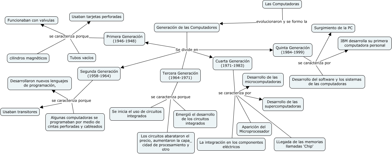 Este Cmap, tiene información relacionada con: Generación de las computadoras, Tercera Generación (1964-1971) se caracteriza porque Emergió el desarrollo de los circuitos integrados, Segunda Generación (1958-1964) se caracteriza porque Algunas computadoras se programaban por medio de cintas perforadas y cableados, Quinta Generación (1984-1999) se caracteriza por IBM desarrolla su primera computadora personal, Primera Generación (1946-1948) se caracteriza porque cilindros magnéticos, Segunda Generación (1958-1964) se caracteriza porque Desarrollaron nuevos lenguajes de programación,, Primera Generación (1946-1948) se caracteriza porque Usaban tarjetas perforadas, Tercera Generación (1964-1971) se caracteriza porque Los circuitos abarataron el precio, aumentaron la capa_ cidad de procesamiento y otro, Las Computadoras evolucionaron y se formo la Generación de las Computadores, Generación de las Computadores Se divide en Tercera Generación (1964-1971), Generación de las Computadores Se divide en Segunda Generación (1958-1964), Cuarta Generación (1971-1983) se caracteriza por Aparición del Microprocesador, Cuarta Generación (1971-1983) se caracteriza por Desarrollo de las supercomputadoras, Tercera Generación (1964-1971) se caracteriza porque Se inicia el uso de circuitos integrados, Quinta Generación (1984-1999) se caracteriza por Surgimiento de la PC, Generación de las Computadores Se divide en Primera Generación (1946-1948), Cuarta Generación (1971-1983) se caracteriza por LLegada de las memorias llamadas 'Chip', Segunda Generación (1958-1964) se caracteriza porque Usaban transitores, Quinta Generación (1984-1999) se caracteriza por Desarrollo del software y los sistemas de las computadoras, Cuarta Generación (1971-1983) se caracteriza por Desarrollo de las microcomputadoras, Primera Generación (1946-1948) se caracteriza porque Funcionaban con valvulas