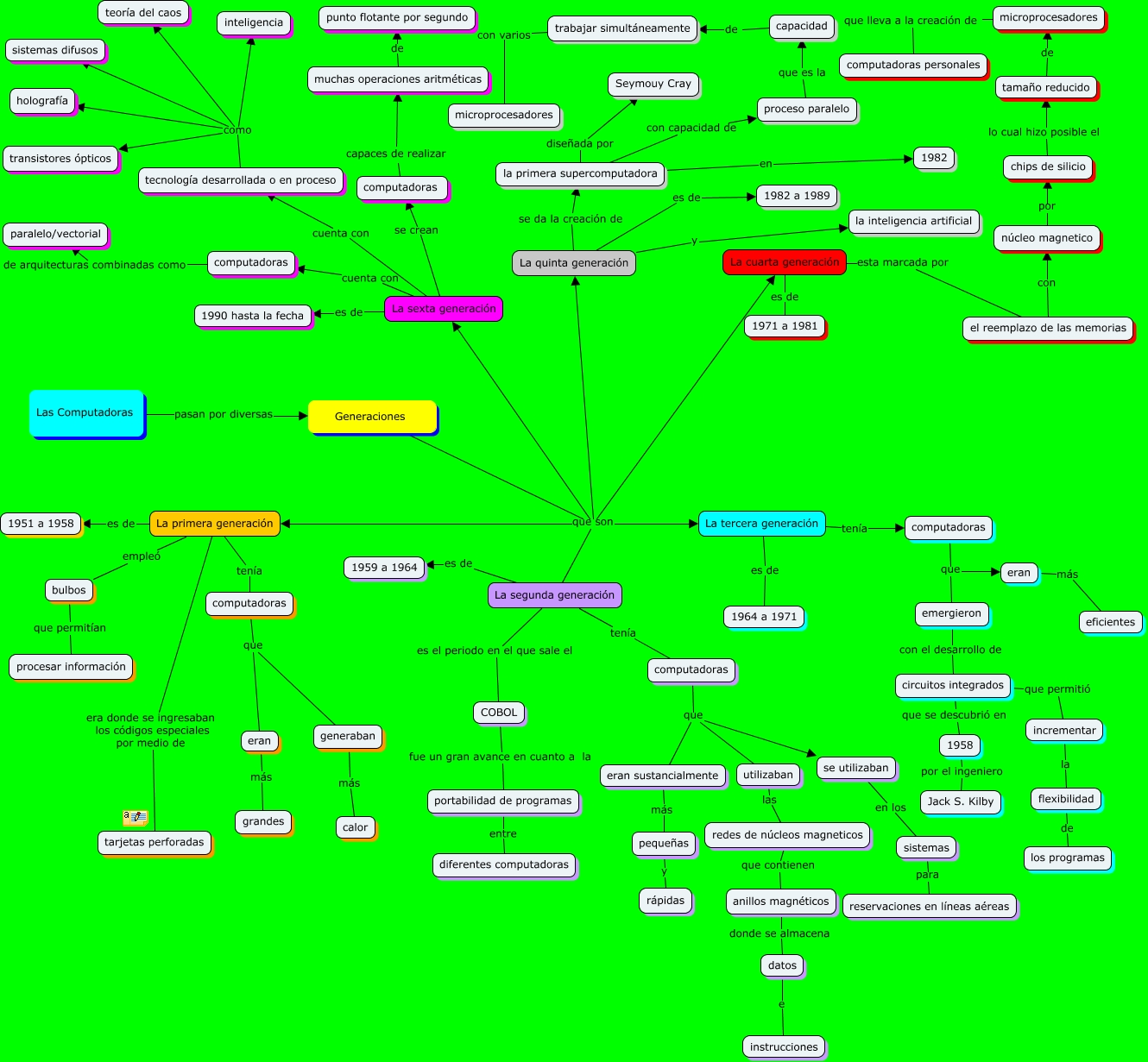 Este Cmap, tiene información relacionada con: generaciones de la computadora, la primera supercomputadora diseñada por Seymouy Cray, Generaciones que son La primera generación, la primera supercomputadora con capacidad de proceso paralelo, Generaciones que son La cuarta generación, La cuarta generación es de 1971 a 1981, datos e instrucciones, utilizaban las redes de núcleos magneticos, eran sustancialmente más pequeñas, Generaciones que son La tercera generación, generaban más calor, la primera supercomputadora en 1982, bulbos que permitían procesar información, La sexta generación es de 1990 hasta la fecha, Generaciones que son La quinta generación, tecnología desarrollada o en proceso como teoría del caos, tamaño reducido de microprocesadores, La quinta generación y la inteligencia artificial, anillos magnéticos donde se almacena datos, computadoras que generaban, Las Computadoras pasan por diversas Generaciones