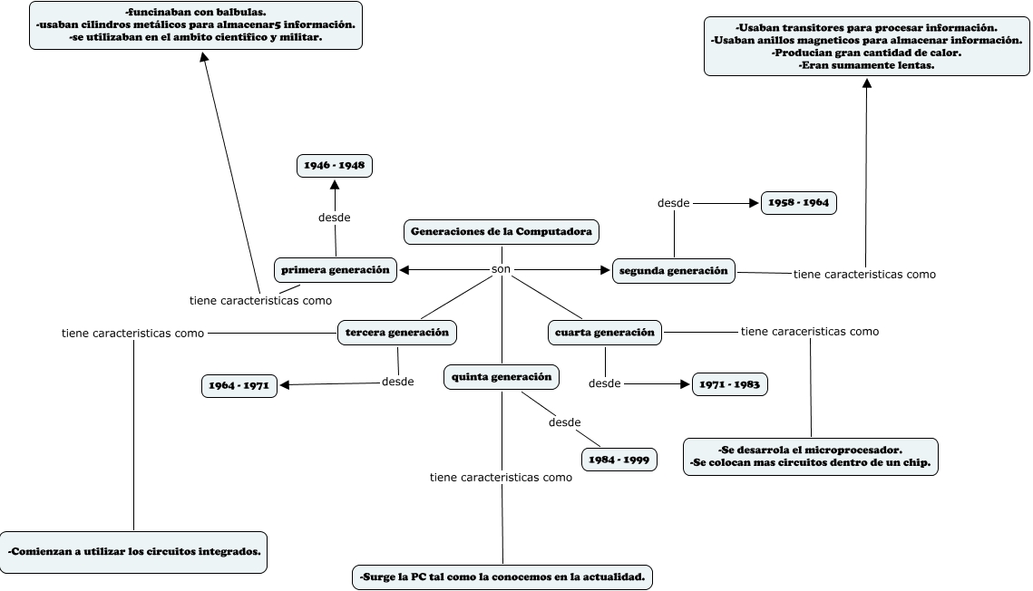 Este Cmap, tiene información relacionada con: generaciones de la computadora, primera generación desde 1946 - 1948, segunda generación tiene caracteristicas como -Usaban transitores para procesar información. -Usaban anillos magneticos para almacenar información. -Producian gran cantidad de calor. -Eran sumamente lentas., primera generación tiene caracteristicas como -funcinaban con balbulas. -usaban cilindros metálicos para almacenar5 información. -se utilizaban en el ambito cientifico y militar., cuarta generación tiene caraceristicas como -Se desarrola el microprocesador. -Se colocan mas circuitos dentro de un chip., Generaciones de la Computadora son quinta generación, Generaciones de la Computadora son segunda generación, quinta generación tiene caracteristicas como -Surge la PC tal como la conocemos en la actualidad., Generaciones de la Computadora son cuarta generación, quinta generación desde 1984 - 1999, tercera generación desde 1964 - 1971, segunda generación desde 1958 - 1964, tercera generación tiene caracteristicas como -Comienzan a utilizar los circuitos integrados., Generaciones de la Computadora son primera generación, Generaciones de la Computadora son tercera generación, cuarta generación desde 1971 - 1983