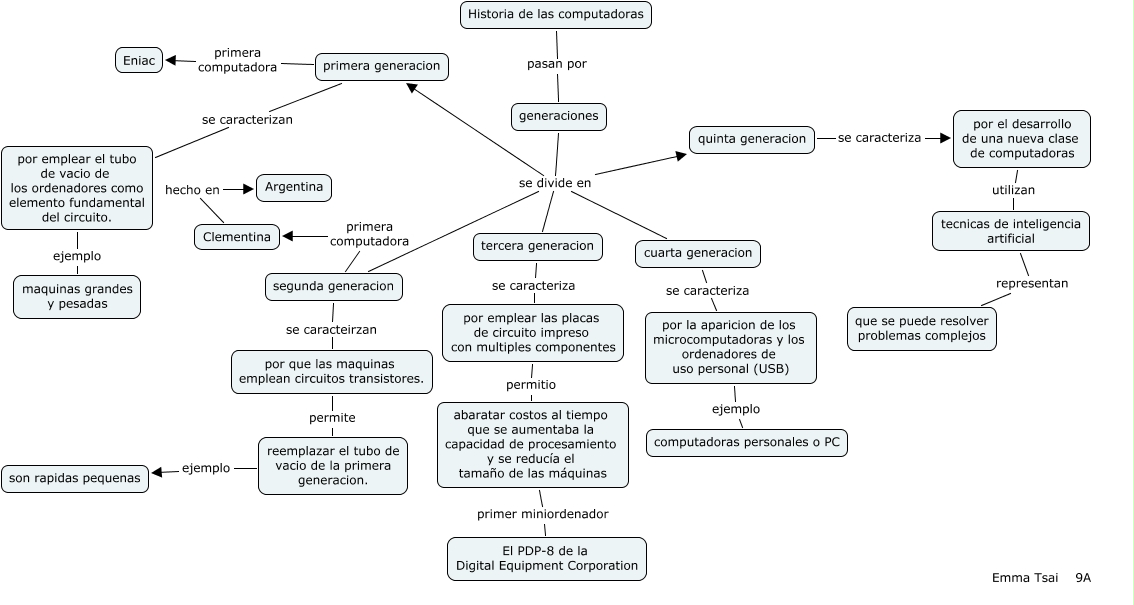 此概念图以 IHMC CmapTools 创建, 内含信息有关于: Generaciones de las computadoras, tercera generacion se caracteriza por emplear las placas de circuito impreso con multiples componentes, cuarta generacion se caracteriza por la aparicion de los microcomputadoras y los ordenadores de uso personal (USB), por emplear el tubo de vacio de los ordenadores como elemento fundamental del circuito. ejemplo maquinas grandes y pesadas, Historia de las computadoras pasan por generaciones, por que las maquinas emplean circuitos transistores. permite reemplazar el tubo de vacio de la primera generacion., por la aparicion de los microcomputadoras y los ordenadores de uso personal (USB) ejemplo computadoras personales o PC, tecnicas de inteligencia artificial representan que se puede resolver problemas complejos, generaciones se divide en cuarta generacion, segunda generacion se caracteirzan por que las maquinas emplean circuitos transistores., segunda generacion primera computadora Clementina, por el desarrollo de una nueva clase de computadoras utilizan tecnicas de inteligencia artificial, primera generacion se caracterizan por emplear el tubo de vacio de los ordenadores como elemento fundamental del circuito., generaciones se divide en primera generacion, generaciones se divide en segunda generacion, reemplazar el tubo de vacio de la primera generacion. ejemplo son rapidas pequenas, por emplear las placas de circuito impreso con multiples componentes permitio abaratar costos al tiempo que se aumentaba la capacidad de procesamiento y se reducía el tamaño de las máquinas, generaciones se divide en tercera generacion, Clementina hecho en Argentina, generaciones se divide en quinta generacion, primera generacion primera computadora Eniac