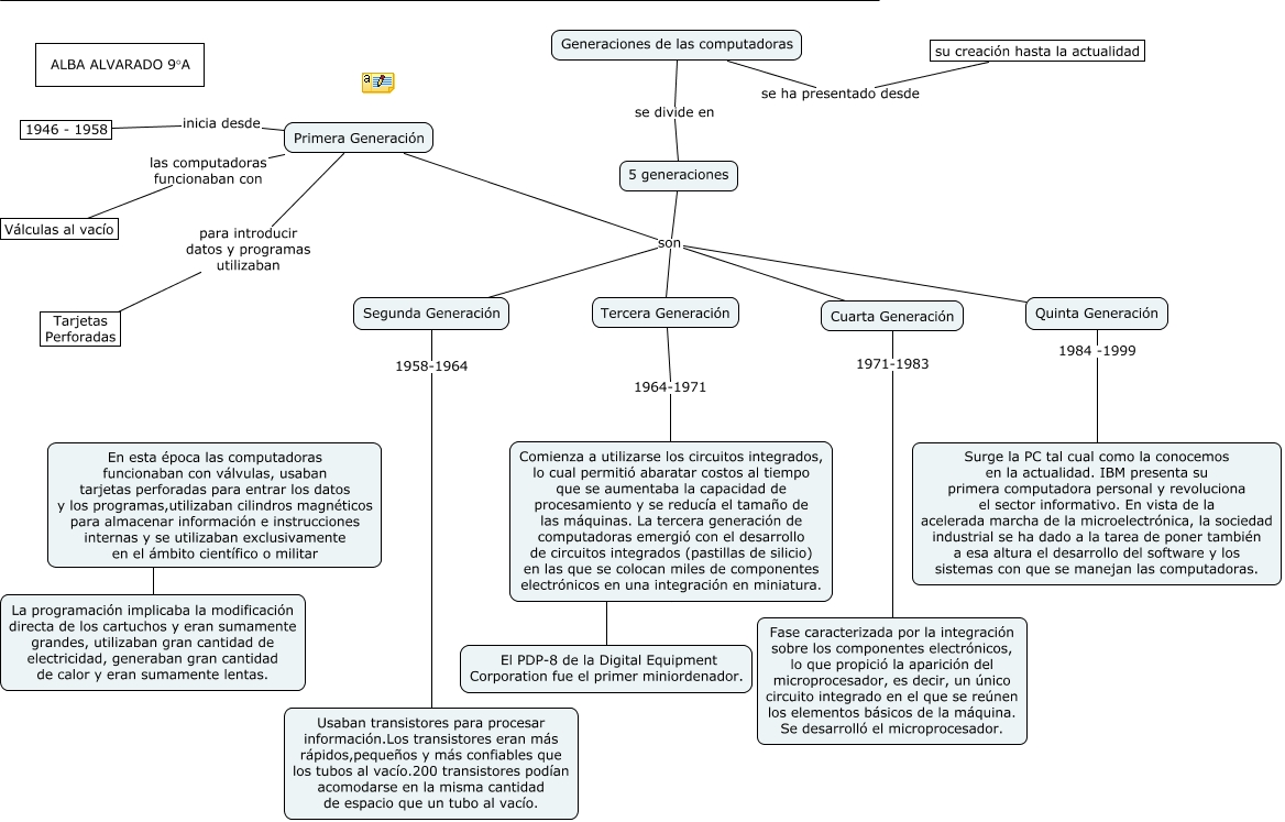 Este Cmap, tiene información relacionada con: generaciones de las computadoras, 5 generaciones son Cuarta Generación, Primera Generación las computadoras funcionaban con Válculas al vacío, 5 generaciones son Tercera Generación, 5 generaciones son Quinta Generación, Primera Generación para introducir datos y programas utilizaban Tarjetas Perforadas, Quinta Generación 1984 -1999 Surge la PC tal cual como la conocemos en la actualidad. IBM presenta su primera computadora personal y revoluciona el sector informativo. En vista de la acelerada marcha de la microelectrónica, la sociedad industrial se ha dado a la tarea de poner también a esa altura el desarrollo del software y los sistemas con que se manejan las computadoras., 5 generaciones son Primera Generación, Generaciones de las computadoras se ha presentado desde su creación hasta la actualidad, Segunda Generación 1958-1964 Usaban transistores para procesar información.Los transistores eran más rápidos,pequeños y más confiables que los tubos al vacío.200 transistores podían acomodarse en la misma cantidad de espacio que un tubo al vacío., 5 generaciones son Segunda Generación, En esta época las computadoras funcionaban con válvulas, usaban tarjetas perforadas para entrar los datos y los programas,utilizaban cilindros magnéticos para almacenar información e instrucciones internas y se utilizaban exclusivamente en el ámbito científico o militar ???? La programación implicaba la modificación directa de los cartuchos y eran sumamente grandes, utilizaban gran cantidad de electricidad, generaban gran cantidad de calor y eran sumamente lentas., Comienza a utilizarse los circuitos integrados, lo cual permitió abaratar costos al tiempo que se aumentaba la capacidad de procesamiento y se reducía el tamaño de las máquinas. La tercera generación de computadoras emergió con el desarrollo de circuitos integrados (pastillas de silicio) en las que se colocan miles de componentes electrónicos en una integración en miniatura. ???? El PDP-8 de la Digital Equipment Corporation fue el primer miniordenador., Generaciones de las computadoras se divide en 5 generaciones, Tercera Generación 1964-1971 Comienza a utilizarse los circuitos integrados, lo cual permitió abaratar costos al tiempo que se aumentaba la capacidad de procesamiento y se reducía el tamaño de las máquinas. La tercera generación de computadoras emergió con el desarrollo de circuitos integrados (pastillas de silicio) en las que se colocan miles de componentes electrónicos en una integración en miniatura., Cuarta Generación 1971-1983 Fase caracterizada por la integración sobre los componentes electrónicos, lo que propició la aparición del microprocesador, es decir, un único circuito integrado en el que se reúnen los elementos básicos de la máquina. Se desarrolló el microprocesador., Primera Generación inicia desde 1946 - 1958