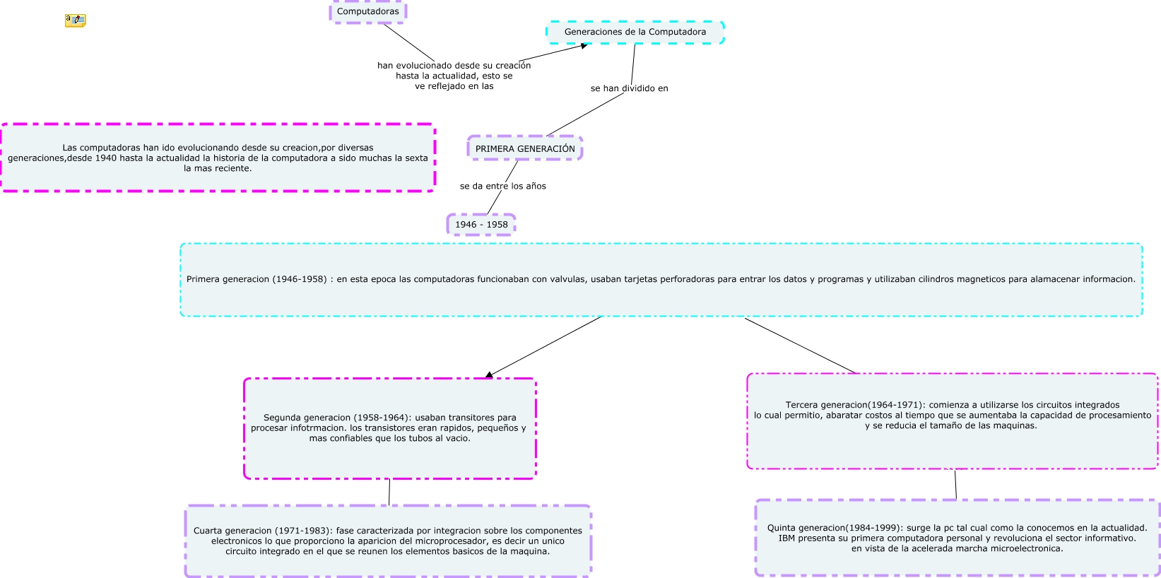 Este Cmap, tiene información relacionada con: Dulari Ch 9a, Generaciones de la Computadora se han dividido en PRIMERA GENERACIÓN, Segunda generacion (1958-1964): usaban transitores para procesar infotrmacion. los transistores eran rapidos, pequeños y mas confiables que los tubos al vacio. ???? Primera generacion (1946-1958) : en esta epoca las computadoras funcionaban con valvulas, usaban tarjetas perforadoras para entrar los datos y programas y utilizaban cilindros magneticos para alamacenar informacion., Segunda generacion (1958-1964): usaban transitores para procesar infotrmacion. los transistores eran rapidos, pequeños y mas confiables que los tubos al vacio. ???? Cuarta generacion (1971-1983): fase caracterizada por integracion sobre los componentes electronicos lo que proporciono la aparicion del microprocesador, es decir un unico circuito integrado en el que se reunen los elementos basicos de la maquina., Primera generacion (1946-1958) : en esta epoca las computadoras funcionaban con valvulas, usaban tarjetas perforadoras para entrar los datos y programas y utilizaban cilindros magneticos para alamacenar informacion. ???? Tercera generacion(1964-1971): comienza a utilizarse los circuitos integrados lo cual permitio, abaratar costos al tiempo que se aumentaba la capacidad de procesamiento y se reducia el tamaño de las maquinas., Tercera generacion(1964-1971): comienza a utilizarse los circuitos integrados lo cual permitio, abaratar costos al tiempo que se aumentaba la capacidad de procesamiento y se reducia el tamaño de las maquinas. ???? Quinta generacion(1984-1999): surge la pc tal cual como la conocemos en la actualidad. IBM presenta su primera computadora personal y revoluciona el sector informativo. en vista de la acelerada marcha microelectronica., Computadoras han evolucionado desde su creación hasta la actualidad, esto se ve reflejado en las Generaciones de la Computadora, PRIMERA GENERACIÓN se da entre los años 1946 - 1958