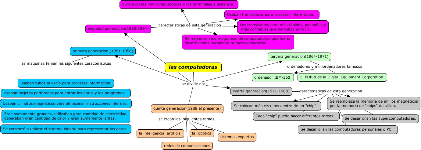 Este Cmap, tiene información relacionada con: generaciones de computadoras, tercera generacion(1964-1971) ordenadores y miniordenadores famosos ordenador IBM-360, cuarta generacion(1971-1988) caracteristicas de esta generacion Se colocan más circuitos dentro de un "chip"., segunda generacion(1958-1964) caracteristicas de esta generacion Usaban transistores para procesar información., cuarta generacion(1971-1988) caracteristicas de esta generacion Se reemplaza la memoria de anillos magnéticos por la memoria de "chips" de silicio., primera generacion (1951-1958) las maquinas tenian las siguientes caracteristicas Usaban cilindros magnéticos para almacenar instrucciones internas., las computadoras se divide en: quinta generacion(1988 al presente), quinta generacion(1988 al presente) se crean las siguientes ramas redes de comunicaciones, las computadoras se divide en: tercera generacion(1964-1971), tercera generacion(1964-1971) ordenadores y miniordenadores famosos El PDP-8 de la Digital Equipment Corporation, cuarta generacion(1971-1988) caracteristicas de esta generacion Se desarrollan las computadoras personales o PC., quinta generacion(1988 al presente) se crean las siguientes ramas la inteligencia artificial, cuarta generacion(1971-1988) caracteristicas de esta generacion Se desarrollan las supercomputadoras., las computadoras se divide en: segunda generacion(1958-1964), quinta generacion(1988 al presente) se crean las siguientes ramas sistemas expertos, primera generacion (1951-1958) las maquinas tenian las siguientes caracteristicas Se comenzó a utilizar el sistema binario para representar los datos., las computadoras se divide en: primera generacion (1951-1958), cuarta generacion(1971-1988) caracteristicas de esta generacion Cada "chip" puede hacer diferentes tareas., primera generacion (1951-1958) las maquinas tenian las siguientes caracteristicas Eran sumamente grandes, utilizaban gran cantidad de electricidad, generaban gran cantidad de calor y eran sumamente lentas., segunda generacion(1958-1964) caracteristicas de esta generacion Los transistores eran más rápidos, pequeños y más confiables que los tubos al vacío., quinta generacion(1988 al presente) se crean las siguientes ramas la robotica