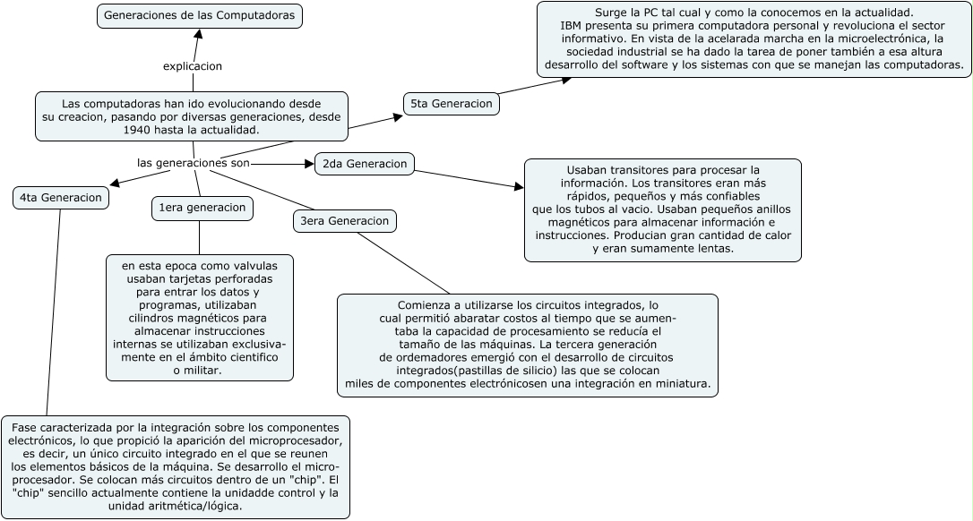 Este Cmap, tiene información relacionada con: Sin Título 1, 1era generacion ???? en esta epoca como valvulas usaban tarjetas perforadas para entrar los datos y programas, utilizaban cilindros magnéticos para almacenar instrucciones internas se utilizaban exclusiva- mente en el ámbito cientifico o militar., 3era Generacion ???? Comienza a utilizarse los circuitos integrados, lo cual permitió abaratar costos al tiempo que se aumen- taba la capacidad de procesamiento se reducía el tamaño de las máquinas. La tercera generación de ordemadores emergió con el desarrollo de circuitos integrados(pastillas de silicio) las que se colocan miles de componentes electrónicosen una integración en miniatura., Las computadoras han ido evolucionando desde su creacion, pasando por diversas generaciones, desde 1940 hasta la actualidad. las generaciones son 4ta Generacion, 5ta Generacion ???? Surge la PC tal cual y como la conocemos en la actualidad. IBM presenta su primera computadora personal y revoluciona el sector informativo. En vista de la acelarada marcha en la microelectrónica, la sociedad industrial se ha dado la tarea de poner también a esa altura desarrollo del software y los sistemas con que se manejan las computadoras., Las computadoras han ido evolucionando desde su creacion, pasando por diversas generaciones, desde 1940 hasta la actualidad. las generaciones son 5ta Generacion, Las computadoras han ido evolucionando desde su creacion, pasando por diversas generaciones, desde 1940 hasta la actualidad. las generaciones son 2da Generacion, Las computadoras han ido evolucionando desde su creacion, pasando por diversas generaciones, desde 1940 hasta la actualidad. las generaciones son 3era Generacion, 2da Generacion ???? Usaban transitores para procesar la información. Los transitores eran más rápidos, pequeños y más confiables que los tubos al vacio. Usaban pequeños anillos magnéticos para almacenar información e instrucciones. Producian gran cantidad de calor y eran sumamente lentas., 4ta Generacion ???? ????, Las computadoras han ido evolucionando desde su creacion, pasando por diversas generaciones, desde 1940 hasta la actualidad. las generaciones son 1era generacion, Las computadoras han ido evolucionando desde su creacion, pasando por diversas generaciones, desde 1940 hasta la actualidad. explicacion Generaciones de las Computadoras