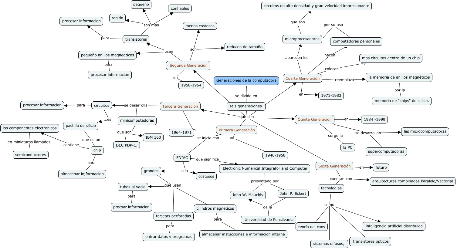 Este Cmap, tiene información relacionada con: generaciones de la computadora, grandes que usan cilindros magneticos, tarjetas perforadas para entrar datos y programas, transistores son mas pequeño, seis generaciones que son Quinta Generación, Generaciones de la computadora se divide en seis generaciones, Primera Generación se inicia con ENIAC, Quinta Generación se desarrollan supercomputadoras, seis generaciones que son Tercera Generación, transistores son mas confiables, Electronic Numerical Integrator and Computer presentado por John P. Eckert, Sexta Generación en futuro, John P. Eckert de la John W. Mauchly, grandes que usan tubos al vacio, Tercera Generación en 1964-1971, Primera Generación se inicia con ENIAC, pequeño anillos magnegticos para procesar informacion, chip para almacenar injformacion, Quinta Generación se desarrollan las microcomputadoras, la memoria de anillos magnéticos por la memoria de "chips" de silicio., transistores son mas rapido