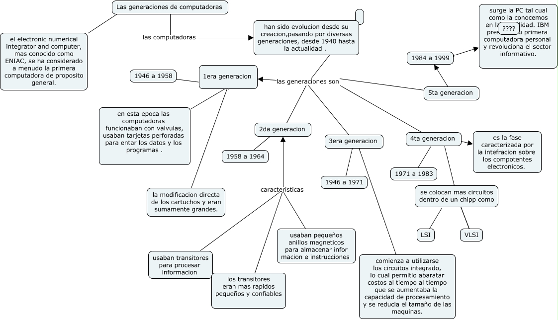 Este Cmap, tiene información relacionada con: Sin Título 1, se colocan mas circuitos dentro de un chipp como ???? VLSI, 2da generacion las generaciones son 1era generacion, 4ta generacion ???? 1971 a 1983, se colocan mas circuitos dentro de un chipp como ???? VLSI, usaban transitores para procesar informacion caracteristicas 2da generacion, usaban transitores para procesar informacion caracteristicas los transitores eran mas rapidos pequeños y confiables, usaban pequeños anillos magneticos para almacenar infor macion e instrucciones caracteristicas 2da generacion, 5ta generacion las generaciones son, 4ta generacion las generaciones son, 1984 a 1999 ???? surge la PC tal cual como la conocemos en la actualidad. IBM presenta su primera computadora personal y revoluciona el sector informativo., 1946 a 1971 ???? 3era generacion, 2da generacion las generaciones son, 4ta generacion ???? es la fase caracterizada por la intefracion sobre los compotentes electronicos., 3era generacion las generaciones son 1era generacion, 4ta generacion las generaciones son 1era generacion, comienza a utilizarse los circuitos integrado, lo cual permitio abaratar costos al tiempo al tiempo que se aumentaba la capacidad de procesamiento y se reducia el tamaño de las maquinas. ???? 3era generacion, 5ta generacion las generaciones son 1era generacion, 1946 a 1958 ???? 1era generacion, 3era generacion las generaciones son, el electronic numerical integrator and computer, mas conocido como ENIAC, se ha considerado a menudo la primera computadora de proposito general. ???? Las generaciones de computadoras