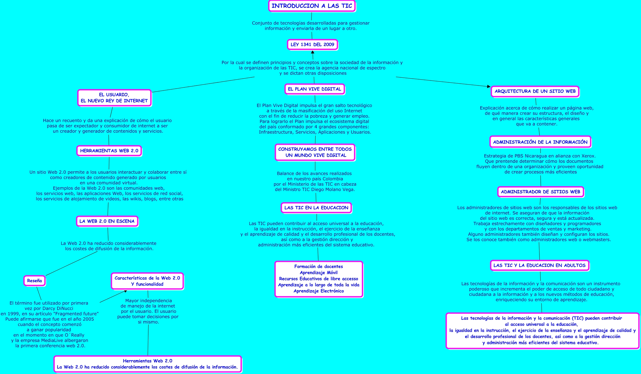 Este Cmap, tiene información relacionada con: INTRO A LAS TIC, INTRODUCCION A LAS TIC Conjunto de tecnologías desarrolladas para gestionar información y enviarla de un lugar a otro. LEY 1341 DEL 2009, LAS TIC EN LA EDUCACION Las TIC pueden contribuir al acceso universal a la educación, la igualdad en la instrucción, el ejercicio de la enseñanza y el aprendizaje de calidad y el desarrollo profesional de los docentes, así como a la gestión dirección y administración más eficientes del sistema educativo. Formación de docentes Aprendizaje Móvil Recursos Educativos de libre accesso Aprendizaje a lo largo de toda la vida Aprendizaje Electrónico, HERRAMIENTAS WEB 2.0 Un sitio Web 2.0 permite a los usuarios interactuar y colaborar entre sí como creadores de contenido generado por usuarios en una comunidad virtual. Ejemplos de la Web 2.0 son las comunidades web, los servicios web, las aplicaciones Web, los servicios de red social, los servicios de alojamiento de videos, las wikis, blogs, entre otras LA WEB 2.0 EN ESCENA, ADMINISTRACIÓN DE LA INFORMACIÓN Estrategia de PBS Nicaragua en alianza con Xerox. Que prentende determinar cómo los documentos fluyen dentro de una organización y proveen oportunidad de crear procesos más eficientes ADMINISTRADOR DE SITIOS WEB, LA WEB 2.0 EN ESCENA La Web 2.0 ha reducido considerablemente los costes de difusión de la información. Reseña, ADMINISTRADOR DE SITIOS WEB Los administradores de sitios web son los responsables de los sitios web de internet. Se aseguran de que la información del sitio web es correcta, segura y está actualizada. Trabaja estrechamente con diseñadores y programadores y con los departamentos de ventas y marketing. Alguno administradores también diseñan y configuran los sitios. Se los conoce también como administradores web o webmasters. LAS TIC Y LA EDUCACION EN ADULTOS, EL USUARIO, EL NUEVO REY DE INTERNET Por la cual se definen principios y conceptos sobre la sociedad de la información y la organización de las TIC, se crea la agencia nacional de espectro y se dictan otras disposiciones ARQUITECTURA DE UN SITIO WEB, ARQUITECTURA DE UN SITIO WEB Explicación acerca de cómo realizar un página web, de qué manera crear su estructura, el diseño y en general las características generales que va a contener. ADMINISTRACIÓN DE LA INFORMACIÓN, CONSTRUYAMOS ENTRE TODOS UN MUNDO VIVE DIGITAL Balance de los avances realizados en nuestro país Colombia por el Ministerio de las TIC en cabeza del Ministro TIC Diego Molano Vega. LAS TIC EN LA EDUCACION, Características de la Web 2.0 Y funcionalidad Mayor independencia de manejo de la internet por el usuario. El usuario puede tomar decisiones por si mismo. Herramientas Web 2.0 La Web 2.0 ha reducido considerablemente los costes de difusión de la información., EL USUARIO, EL NUEVO REY DE INTERNET Hace un recuento y da una explicación de cómo el usuario pasa de ser expectador y consumidor de internet a ser un creador y generador de contenidos y servicios. HERRAMIENTAS WEB 2.0, EL PLAN VIVE DIGITAL El Plan Vive Digital impulsa el gran salto tecnológico a través de la masificación del uso Internet con el fin de reducir la pobreza y generar empleo. Para lograrlo el Plan impulsa el ecosistema digital del país conformado por 4 grandes componentes: Infraestructura, Servicios, Aplicaciones y Usuarios. CONSTRUYAMOS ENTRE TODOS UN MUNDO VIVE DIGITAL, EL USUARIO, EL NUEVO REY DE INTERNET Por la cual se definen principios y conceptos sobre la sociedad de la información y la organización de las TIC, se crea la agencia nacional de espectro y se dictan otras disposiciones LEY 1341 DEL 2009, Reseña El término fue utilizado por primera vez por Darcy DiNucci en 1999, en su artículo "Fragmented future" Puede afirmarse que fue en el año 2005 cuando el concepto comenzó a ganar popularidad en el momento en que O´Really y la empresa MediaLive albergaron la primera conferencia web 2.0. Características de la Web 2.0 Y funcionalidad, LAS TIC Y LA EDUCACION EN ADULTOS Las tecnologías de la información y la comunicación son un instrumento poderoso que incrementa el poder de acceso de todo ciudadano y ciudadana a la información y a los nuevos métodos de educación, enriqueciendo su entorno de aprendizaje. Las tecnologías de la información y la comunicación (TIC) pueden contribuir al acceso universal a la educación, la igualdad en la instrucción, el ejercicio de la enseñanza y el aprendizaje de calidad y el desarrollo profesional de los docentes, así como a la gestión dirección y administración más eficientes del sistema educativo., EL USUARIO, EL NUEVO REY DE INTERNET Por la cual se definen principios y conceptos sobre la sociedad de la información y la organización de las TIC, se crea la agencia nacional de espectro y se dictan otras disposiciones EL PLAN VIVE DIGITAL