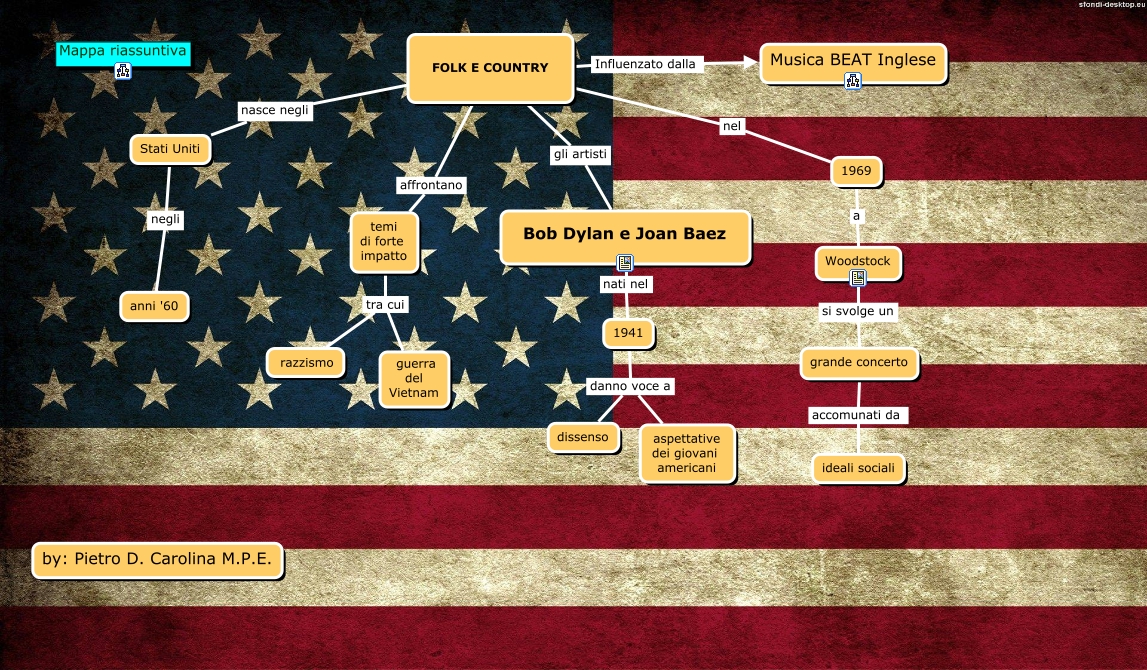 Questa Cmap, creata con IHMC CmapTools, contiene informazioni relative a: L56 P2 Folk e Country, FOLK E COUNTRY nel 1969, grande concerto accomunati da ideali sociali, Woodstock si svolge un grande concerto, 1941 danno voce a dissenso, FOLK E COUNTRY gli artisti Bob Dylan e Joan Baez, Bob Dylan e Joan Baez nati nel 1941, temi di forte impatto tra cui razzismo, 1969 a Woodstock, temi di forte impatto tra cui guerra del Vietnam, Stati Uniti negli anni '60, FOLK E COUNTRY nasce negli Stati Uniti, FOLK E COUNTRY affrontano temi di forte impatto, 1941 danno voce a aspettative dei giovani americani, FOLK E COUNTRY Influenzato dalla Musica BEAT Inglese
