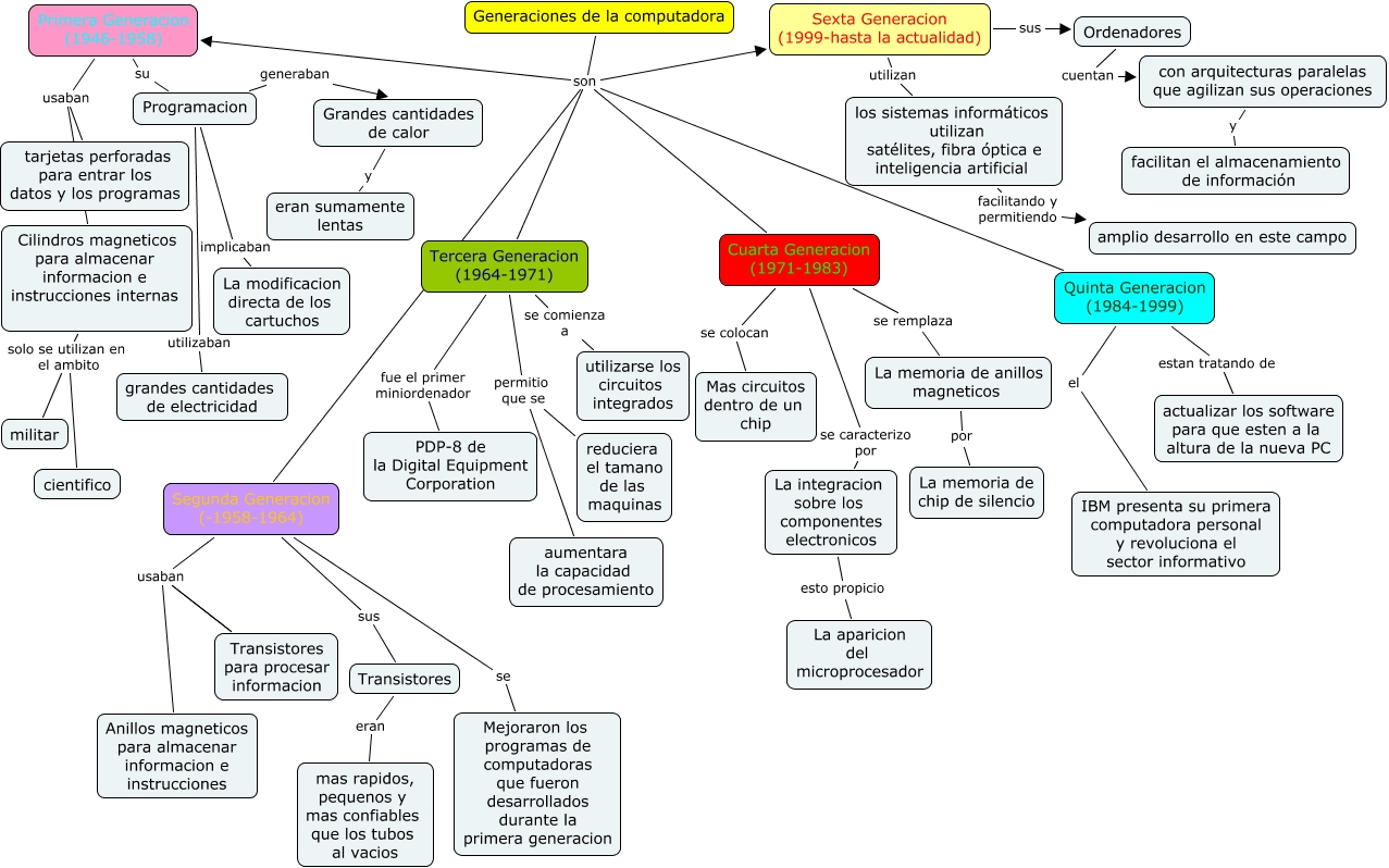 This Concept Map, created with IHMC CmapTools, has information related to: lia fung 9a, Tercera Generacion (1964-1971) permitio que se aumentara la capacidad de procesamiento, Generaciones de la computadora son Cuarta Generacion (1971-1983), La memoria de anillos magneticos por La memoria de chip de silencio, Quinta Generacion (1984-1999) el IBM presenta su primera computadora personal y revoluciona el sector informativo, Segunda Generacion (-1958-1964) se Mejoraron los programas de computadoras que fueron desarrollados durante la primera generacion, Transistores eran mas rapidos, pequenos y mas confiables que los tubos al vacios, Segunda Generacion (-1958-1964) usaban Anillos magneticos para almacenar informacion e instrucciones, Primera Generacion (1946-1958) su Programacion, La integracion sobre los componentes electronicos esto propicio La aparicion del microprocesador, Cilindros magneticos para almacenar informacion e instrucciones internas solo se utilizan en el ambito militar, Generaciones de la computadora son Primera Generacion (1946-1958), Quinta Generacion (1984-1999) estan tratando de actualizar los software para que esten a la altura de la nueva PC, los sistemas informáticos utilizan satélites, fibra óptica e inteligencia artificial facilitando y permitiendo amplio desarrollo en este campo, Primera Generacion (1946-1958) usaban tarjetas perforadas para entrar los datos y los programas, Tercera Generacion (1964-1971) se comienza a utilizarse los circuitos integrados, Tercera Generacion (1964-1971) permitio que se reduciera el tamano de las maquinas, Programacion utilizaban grandes cantidades de electricidad, Segunda Generacion (-1958-1964) usaban Transistores para procesar informacion, Segunda Generacion (-1958-1964) usaban Transistores para procesar informacion, Generaciones de la computadora son Quinta Generacion (1984-1999)