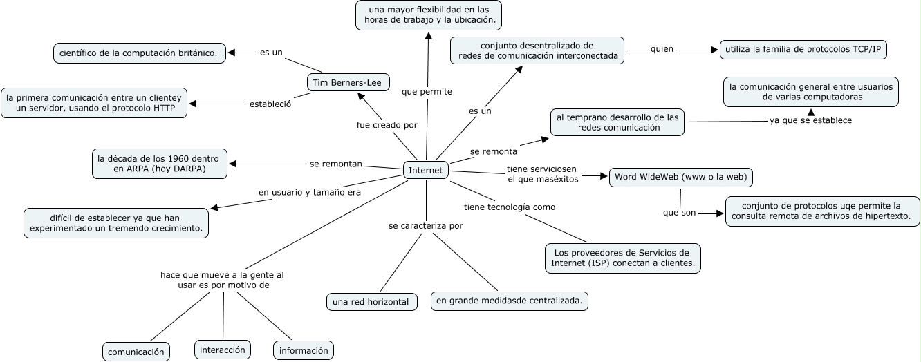 Este Cmap, tiene información relacionada con: Ricardo, Internet hace que mueve a la gente al usar es por motivo de comunicación, Internet se remonta al temprano desarrollo de las redes comunicación, Internet tiene serviciosen el que maséxitos Word WideWeb (www o la web), Internet se caracteriza por en grande medidasde centralizada., al temprano desarrollo de las redes comunicación ya que se establece la comunicación general entre usuarios de varias computadoras, Internet se caracteriza por una red horizontal, Internet que permite una mayor flexibilidad en las horas de trabajo y la ubicación., conjunto desentralizado de redes de comunicación interconectada quien utiliza la familia de protocolos TCP/IP, Internet es un conjunto desentralizado de redes de comunicación interconectada, Internet tiene tecnología como Los proveedores de Servicios de Internet (ISP) conectan a clientes., Internet hace que mueve a la gente al usar es por motivo de información, Internet fue creado por Tim Berners-Lee, Internet en usuario y tamaño era difícil de establecer ya que han experimentado un tremendo crecimiento., Tim Berners-Lee es un científico de la computación británico., Word WideWeb (www o la web) que son conjunto de protocolos uqe permite la consulta remota de archivos de hipertexto., Internet hace que mueve a la gente al usar es por motivo de interacción, Tim Berners-Lee estableció la primera comunicación entre un clientey un servidor, usando el protocolo HTTP, Internet se remontan la década de los 1960 dentro en ARPA (hoy DARPA)
