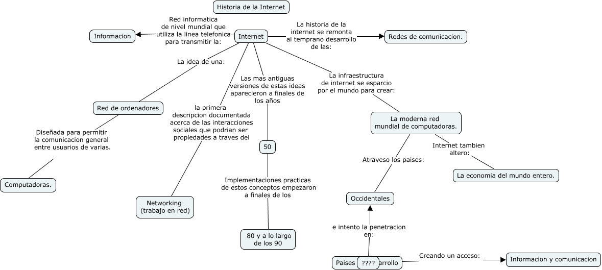 Este Cmap, tiene información relacionada con: Historia de la internet, La moderna red mundial de computadoras. Internet tambien altero: La economia del mundo entero., Internet La historia de la internet se remonta al temprano desarrollo de las: Redes de comunicacion., Paises de Desarrollo Creando un acceso: Informacion y comunicacion, Internet La idea de una: Red de ordenadores, Internet la primera descripcion documentada acerca de las interacciones sociales que podrian ser propiedades a traves del Networking (trabajo en red), Internet Las mas antiguas versiones de estas ideas aparecieron a finales de los años 50, ???? e intento la penetracion en: Occidentales, La moderna red mundial de computadoras. Atraveso los paises: Occidentales, Red de ordenadores Diseñada para permitir la comunicacion general entre usuarios de varias. Computadoras., Internet La infraestructura de internet se esparcio por el mundo para crear: La moderna red mundial de computadoras., Internet Red informatica de nivel mundial que utiliza la linea telefonica para transmitir la: Informacion, 50 Implementaciones practicas de estos conceptos empezaron a finales de los 80 y a lo largo de los 90
