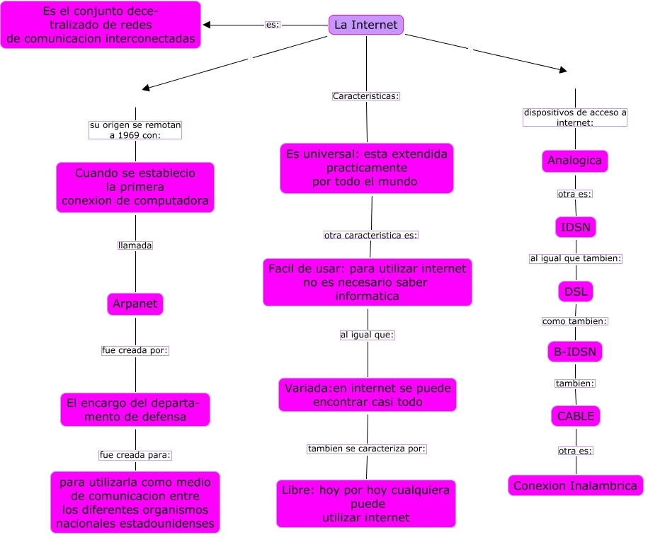 Este Cmap, tiene información relacionada con: historia del internet, La Internet, La Internet Caracteristicas: Es universal: esta extendida practicamente por todo el mundo, CABLE otra es: Conexion Inalambrica, Variada:en internet se puede encontrar casi todo tambien se caracteriza por: Libre: hoy por hoy cualquiera puede utilizar internet, Cuando se establecio la primera conexion de computadora llamada Arpanet, El encargo del departa- mento de defensa fue creada para: para utilizarla como medio de comunicacion entre los diferentes organismos nacionales estadounidenses, Analogica otra es: IDSN, su origen se remotan a 1969 con: Cuando se establecio la primera conexion de computadora, DSL como tambien: B-IDSN, La Internet es: Es el conjunto dece- tralizado de redes de comunicacion interconectadas, Arpanet fue creada por: El encargo del departa- mento de defensa, La Internet, B-IDSN tambien: CABLE, IDSN al igual que tambien: DSL, Facil de usar: para utilizar internet no es necesario saber informatica al igual que: Variada:en internet se puede encontrar casi todo, ???? otra caracteristica es: Facil de usar: para utilizar internet no es necesario saber informatica, dispositivos de acceso a internet: Analogica