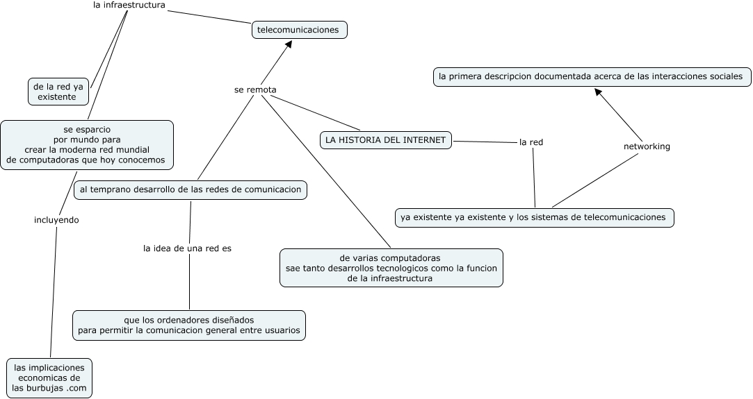 Este Cmap, tiene información relacionada con: la historia del internet, LA HISTORIA DEL INTERNET se remota de varias computadoras sae tanto desarrollos tecnologicos como la funcion de la infraestructura, telecomunicaciones la infraestructura se esparcio por mundo para crear la moderna red mundial de computadoras que hoy conocemos, LA HISTORIA DEL INTERNET se remota al temprano desarrollo de las redes de comunicacion, LA HISTORIA DEL INTERNET la red ya existente ya existente y los sistemas de telecomunicaciones, telecomunicaciones la infraestructura de la red ya existente, LA HISTORIA DEL INTERNET se remota telecomunicaciones, al temprano desarrollo de las redes de comunicacion la idea de una red es que los ordenadores diseñados para permitir la comunicacion general entre usuarios, ya existente ya existente y los sistemas de telecomunicaciones networking la primera descripcion documentada acerca de las interacciones sociales, se esparcio por mundo para crear la moderna red mundial de computadoras que hoy conocemos incluyendo las implicaciones economicas de las burbujas .com
