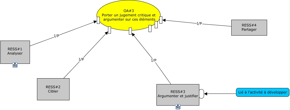 Cette carte de concepts créée avec IHMC CmapTools traite de: OA3, RESS#4 Partager I/P, RESS#1 Analyser I/P, RESS#2 Cibler I/P, Lié à l'activité à développer ????, RESS#3 Argumenter et justifier I/P