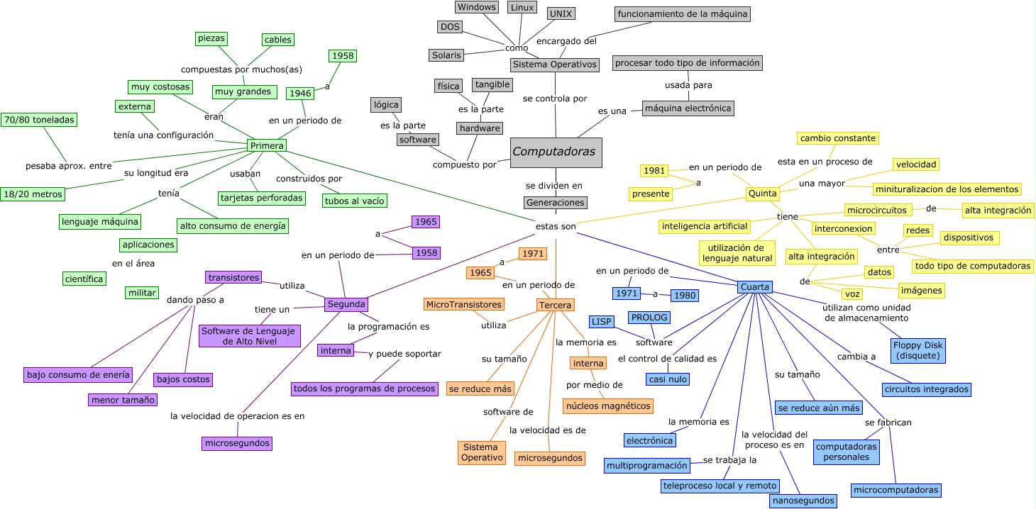 Este Cmap, tiene información relacionada con: Generación de las Computadoras (Stephanie Morris N.), Generaciones estas son Tercera, Sistema Operativos encargado del funcionamiento de la máquina, Cuarta en un periodo de 1971, Tercera su tamaño se reduce más, Cuarta su tamaño se reduce aún más, Cuarta se fabrican computadoras personales, Quinta tiene microcircuitos, Computadoras es una máquina electrónica, 1981 a presente, hardware es la parte física, interconexion entre todo tipo de computadoras, Generaciones estas son Segunda, Primera eran muy costosas, Sistema Operativos como UNIX, interna y puede soportar todos los programas de procesos, Sistema Operativos como Windows, Quinta tiene interconexion, alta integración de imágenes, Segunda en un periodo de 1958, hardware es la parte tangible