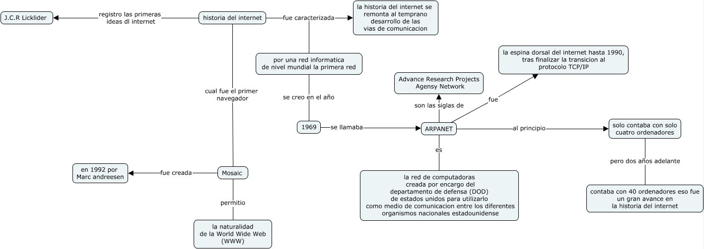 Este Cmap, tiene información relacionada con: historia del internet, ARPANET fue la espina dorsal del internet hasta 1990, tras finalizar la transicion al protocolo TCP/IP, ARPANET es la red de computadoras creada por encargo del departamento de defensa (DOD) de estados unidos para utilizarlo como medio de comunicacion entre los diferentes organismos nacionales estadounidense, ARPANET son las siglas de Advance Research Projects Agensy Network, 1969 se llamaba ARPANET, historia del internet fue caracterizada la historia del internet se remonta al temprano desarrollo de las vias de comunicacion, Mosaic permitio la naturalidad de la World Wide Web (WWW), por una red informatica de nivel mundial la primera red se creo en el año 1969, historia del internet registro las primeras ideas dl internet J.C.R Licklider, historia del internet cual fue el primer navegador Mosaic, Mosaic fue creada en 1992 por Marc andreesen, solo contaba con solo cuatro ordenadores pero dos años adelante contaba con 40 ordenadores eso fue un gran avance en la historia del internet, ARPANET al principio solo contaba con solo cuatro ordenadores, historia del internet fue caracterizada por una red informatica de nivel mundial la primera red