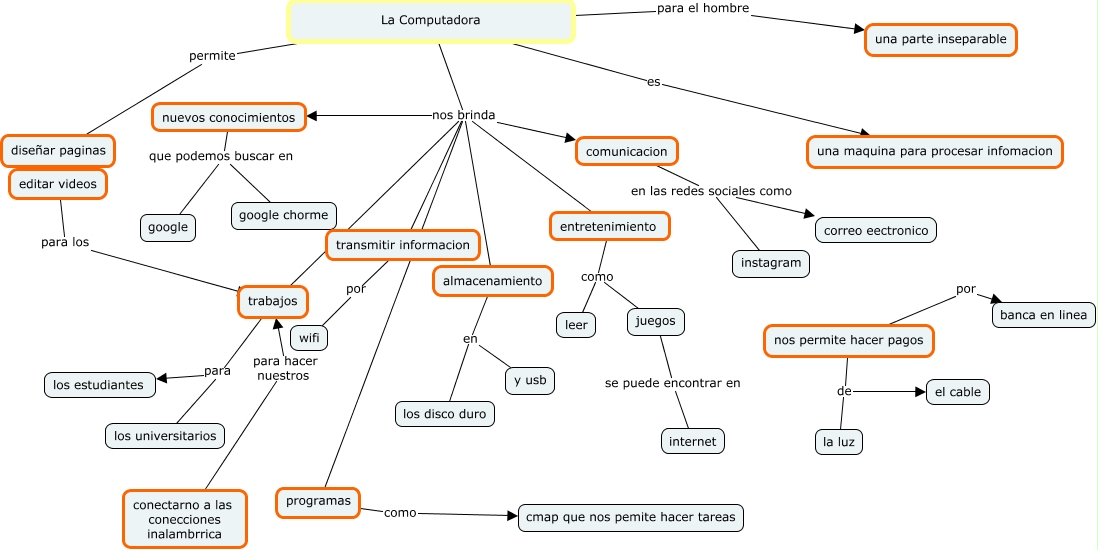 This Concept Map, created with IHMC CmapTools, has information related to: la computadora, almacenamiento en los disco duro, La Computadora para el hombre una parte inseparable, La Computadora es una maquina para procesar infomacion, trabajos para los universitarios, nuevos conocimientos que podemos buscar en google, comunicacion en las redes sociales como instagram, trabajos para los estudiantes, La Computadora nos brinda transmitir informacion, La Computadora nos brinda comunicacion, transmitir informacion por wifi, nos permite hacer pagos de el cable, La Computadora nos brinda nuevos conocimientos, comunicacion en las redes sociales como correo eectronico, La Computadora nos brinda almacenamiento, entretenimiento como leer, programas como cmap que nos pemite hacer tareas, editar videos para los ????, La Computadora nos brinda trabajos, nuevos conocimientos que podemos buscar en google chorme, nos permite hacer pagos por banca en linea