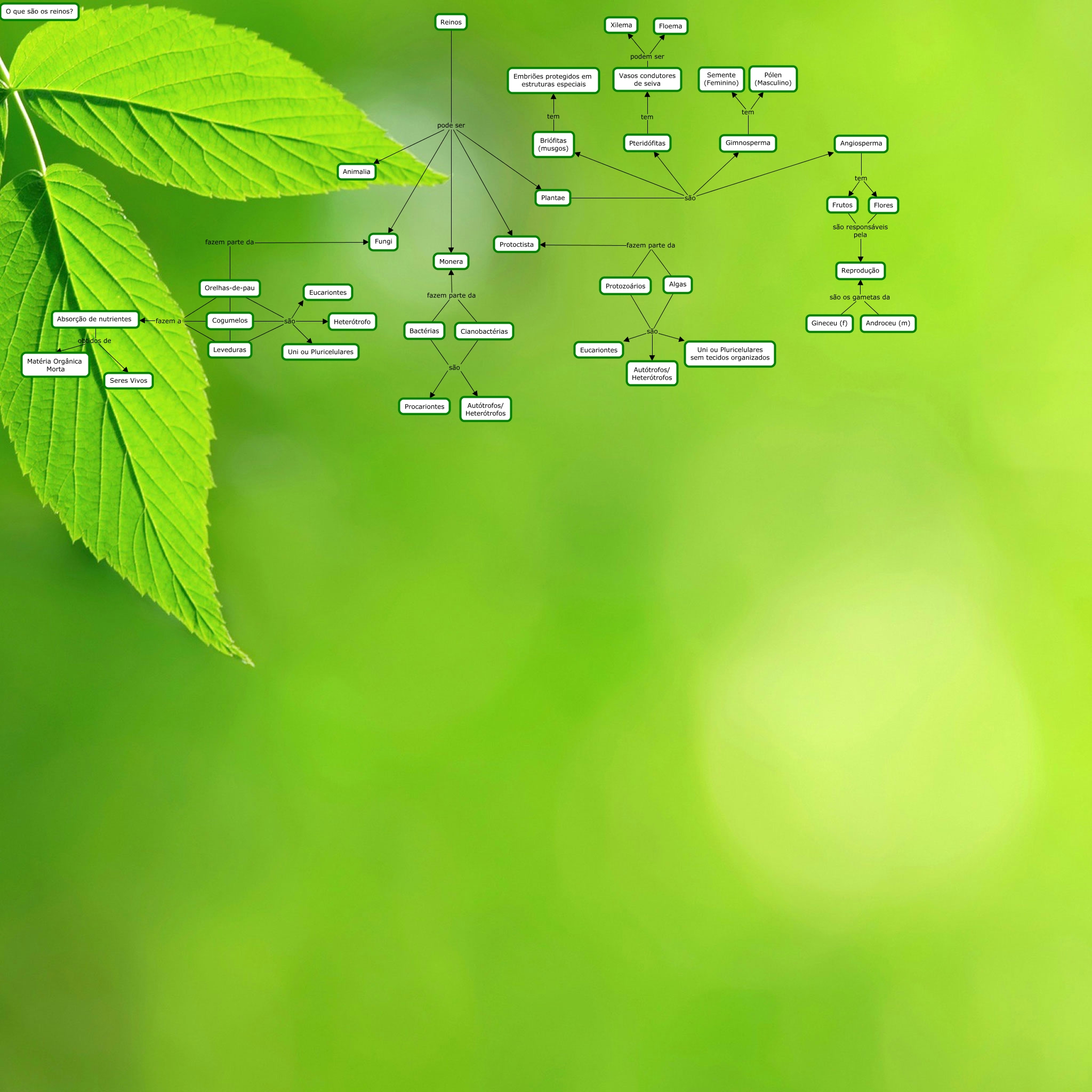 Esse mapa conceitual, produzido no IHMC CmapTools, tem a informação relacionada a: Reinos by MX, Cogumelos são Heterótrofo, Leveduras fazem a Absorção de nutrientes, Leveduras são Uni ou Pluricelulares, Flores são responsáveis pela Reprodução, Absorção de nutrientes obtidos de Seres Vivos, Orelhas-de-pau fazem a Absorção de nutrientes, Frutos são responsáveis pela Reprodução, Protozoários são Eucariontes, Reinos pode ser Plantae, Gimnosperma tem Semente (Feminino), Algas são Eucariontes, Gineceu (f) são os gametas da Reprodução, Gimnosperma tem Pólen (Masculino), Protozoários são Uni ou Pluricelulares sem tecidos organizados, Protozoários são Autótrofos/ Heterótrofos, Vasos condutores de seiva podem ser Xilema, Orelhas-de-pau são Heterótrofo, Reinos pode ser Protoctista, Orelhas-de-pau fazem parte da Fungi, Reinos pode ser Monera