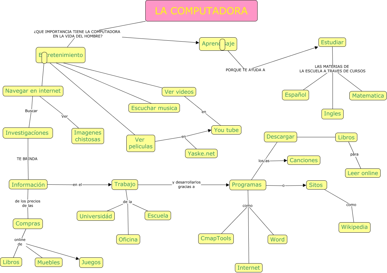 Este Cmap, tiene información relacionada con: mapa conceptual LA COMPUTADORA, Trabajo de la Escuela, Descargar los/as Programas, Información de los precios de las Compras, Información en el Trabajo, Navegar en internet Ver Imagenes chistosas, Trabajo y desarrollarlos gracias a Programas, Programas como CmapTools, Estudiar LAS MATERIAS DE LA ESCUELA A TRAVES DE CURSOS Ingles, Compras online de Libros, Descargar los/as Canciones, Programas o Sitos, Descargar ???? Libros, Trabajo de la Oficina, ???? Ver videos, Ver videos en You tube, Programas como Word, LA COMPUTADORA ¿QUE IMPORTANCIA TIENE LA COMPUTADORA EN LA VIDA DEL HOMBRE? Entretenimiento, LA COMPUTADORA ¿QUE IMPORTANCIA TIENE LA COMPUTADORA EN LA VIDA DEL HOMBRE? Aprendisaje, PORQUE TE AYUDA A Estudiar, Sitos como Wikipedia