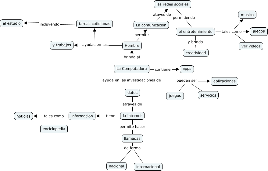 此概念图以 IHMC CmapTools 创建, 内含信息有关于: Importancia de las computadoras, Hombre ayudas en las y trabajos, informacion tales como enciclopedia, el entretenimiento tales como ver videos, las redes sociales permitiendo el entretenimiento, la internet tiene informacion, La Computadora ayuda en las investigaciones de datos, el entretenimiento tales como juegos, apps pueden ser aplicaciones, llamadas de forma nacional, el entretenimiento tales como musica, La Computadora brinda al Hombre, datos atraves de la internet, La Computadora contiene apps, la internet permite hacer llamadas, Hombre permite La comunicacion, apps pueden ser juegos, apps pueden ser servicios, informacion tales como noticias, el entretenimiento y brinda creatividad, tareas cotidianas incluyendo el estudio