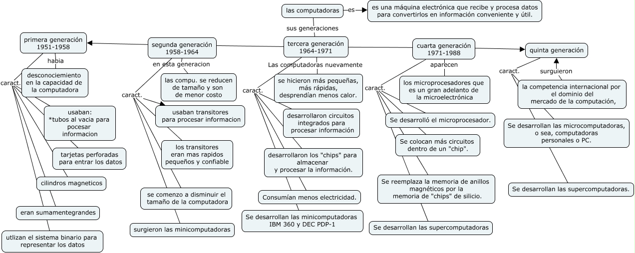 Este Cmap, tiene información relacionada con: las computadoras, tercera generación 1964-1971 caract. Consumían menos electricidad., tercera generación 1964-1971 ???? cuarta generación 1971-1988, primera generación 1951-1958 habia desconociemiento en la capacidad de la computadora, la competencia internacional por el dominio del mercado de la computación, surguieron quinta generación, tercera generación 1964-1971 ???? primera generación 1951-1958, segunda generación 1958-1964 caract. los transitores eran mas rapidos pequeños y confiable, cuarta generación 1971-1988 caract. Se desarrollan las supercomputadoras, cuarta generación 1971-1988 caract. Se colocan más circuitos dentro de un "chip"., tercera generación 1964-1971 caract. Se desarrollan las minicomputadoras IBM 360 y DEC PDP-1, tercera generación 1964-1971 caract. desarrollaron circuitos integrados para procesar información, segunda generación 1958-1964 caract. surgieron las minicomputadoras, tercera generación 1964-1971 ???? quinta generación, quinta generación caract. Se desarrollan las supercomputadoras., las computadoras es es una máquina electrónica que recibe y procesa datos para convertirlos en información conveniente y útil., primera generación 1951-1958 caract. usaban: *tubos al vacia para pocesar informacion, cuarta generación 1971-1988 caract. Se reemplaza la memoria de anillos magnéticos por la memoria de "chips" de silicio., segunda generación 1958-1964 caract. se comenzo a disminuir el tamaño de la computadora, cuarta generación 1971-1988 aparecen los microprocesadores que es un gran adelanto de la microelectrónica, quinta generación caract. Se desarrollan las microcomputadoras, o sea, computadoras personales o PC., segunda generación 1958-1964 caract. usaban transitores para procesar informacion