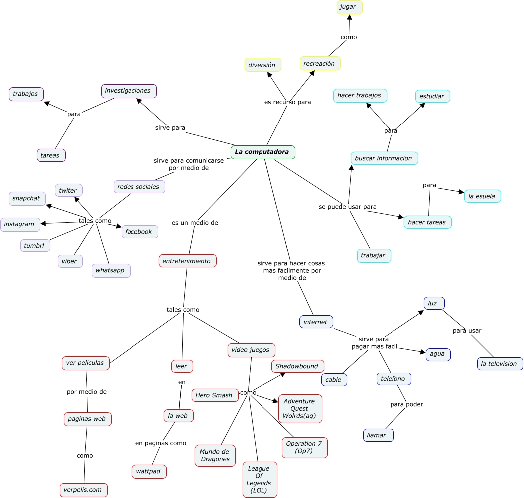 Este Cmap, tiene información relacionada con: La Computadora, entretenimiento tales como video juegos, entretenimiento tales como ver peliculas, hacer tareas para la esuela, redes sociales tales como whatsapp, La computadora es un medio de entretenimiento, leer en la web, paginas web como verpelis.com, internet sirve para pagar mas facil luz, redes sociales tales como tumbrl, buscar informacion para hacer trabajos, redes sociales tales como viber, internet sirve para pagar mas facil agua, recreación como jugar, investigaciones para trabajos, La computadora es recurso para recreación, investigaciones para tareas, video juegos como Mundo de Dragones, luz para usar la television, La computadora es recurso para diversión, telefono para poder llamar