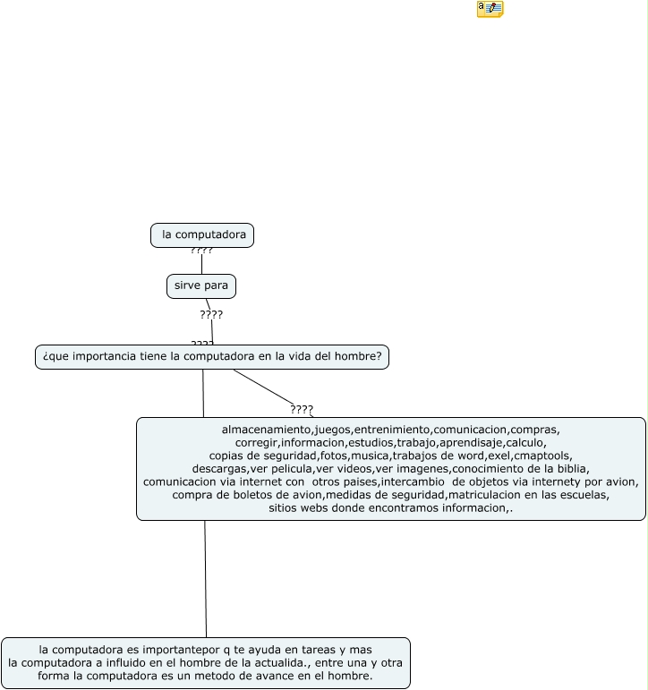 Este Cmap, tiene información relacionada con: la computadora, ¿que importancia tiene la computadora en la vida del hombre? ???? la computadora es importantepor q te ayuda en tareas y mas la computadora a influido en el hombre de la actualida., entre una y otra forma la computadora es un metodo de avance en el hombre., la computadora ???? sirve para, ¿que importancia tiene la computadora en la vida del hombre? ???? almacenamiento,juegos,entrenimiento,comunicacion,compras, corregir,informacion,estudios,trabajo,aprendisaje,calculo, copias de seguridad,fotos,musica,trabajos de word,exel,cmaptools, descargas,ver pelicula,ver videos,ver imagenes,conocimiento de la biblia, comunicacion via internet con otros paises,intercambio de objetos via internety por avion, compra de boletos de avion,medidas de seguridad,matriculacion en las escuelas, sitios webs donde encontramos informacion,., sirve para ???? ¿que importancia tiene la computadora en la vida del hombre?