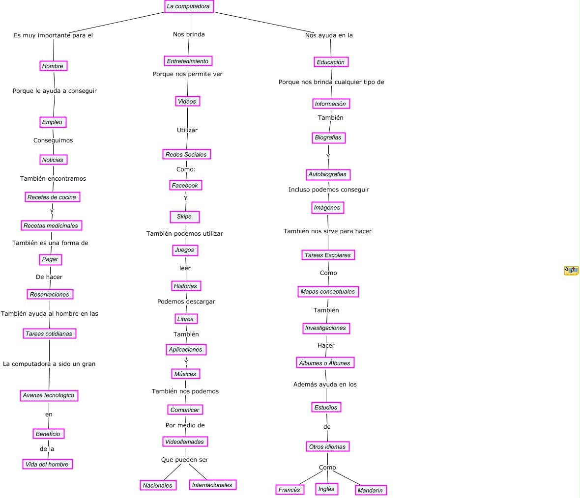 Este Cmap, tiene información relacionada con: La computadora, Videos Utilizar Redes Sociales, Pagar De hacer Reservaciones, Aplicaciones Y Músicas, Recetas de cocina y Recetas medicinales, Músicas También nos podemos Comunicar, Facebook Y Skipe, Juegos leer Historias, Autobiografias Incluso podemos conseguir Imágenes, Beneficio de la Vida del hombre, Videollamadas Que pueden ser Internacionales, Otros idiomas Como Inglés, Investigaciones Hacer Álbumes o Álbunes, Otros idiomas Como Francés, Información También Biografias, Educación Porque nos brinda cualquier tipo de Información, Tareas cotidianas La computadora a sido un gran Avanze tecnologico, Redes Sociales Como: Facebook, Álbumes o Álbunes Además ayuda en los Estudios, La computadora Nos ayuda en la Educación, Skipe También podemos utilizar Juegos