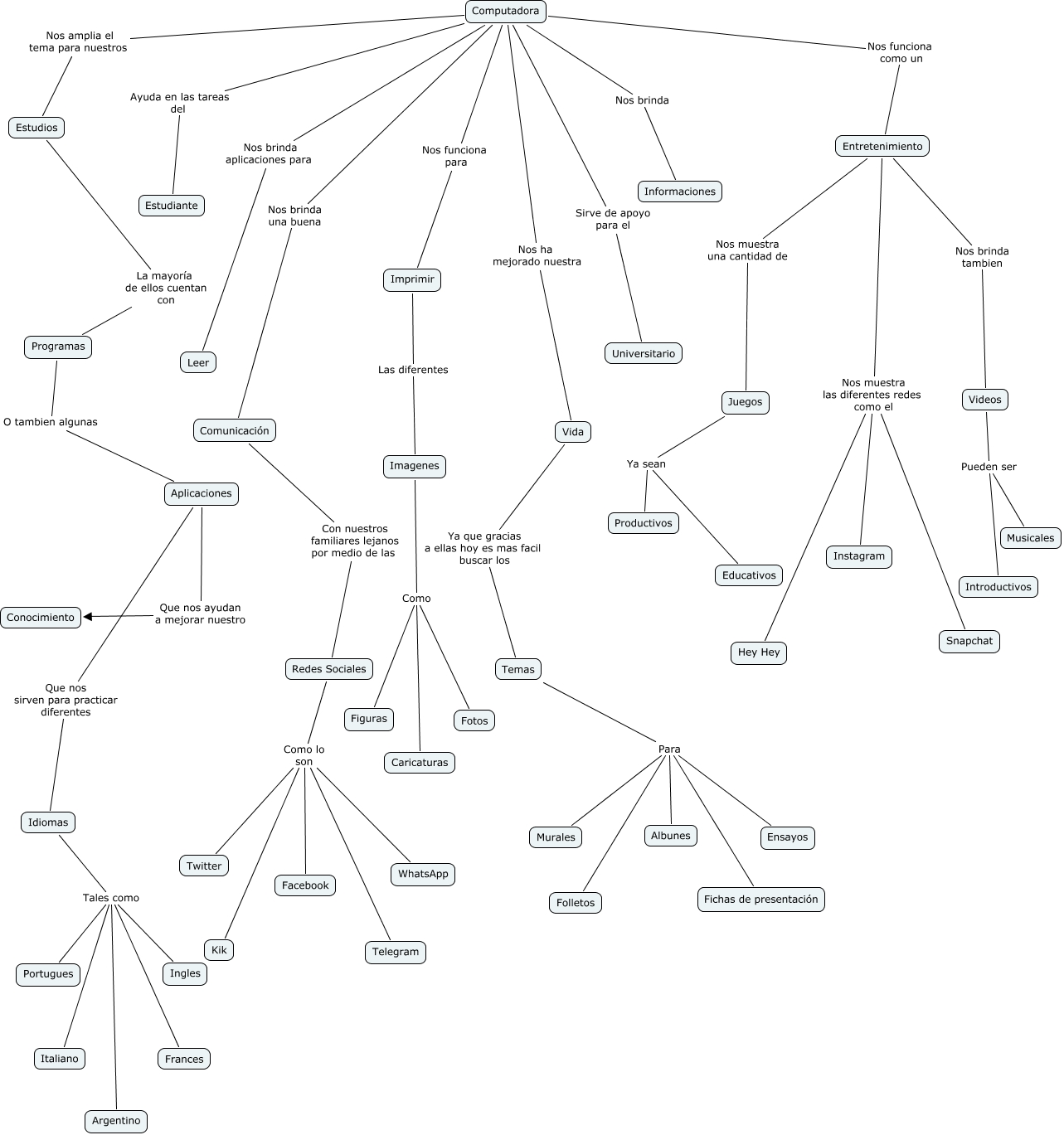 Este Cmap, tiene información relacionada con: La computadora, Computadora Ayuda en las tareas del Estudiante, Temas Para Albunes, Entretenimiento Nos muestra las diferentes redes como el Instagram, Videos Pueden ser Musicales, Aplicaciones Que nos ayudan a mejorar nuestro Conocimiento, Temas Para Fichas de presentación, Redes Sociales Como lo son Twitter, Idiomas Tales como Portugues, Idiomas Tales como Frances, Idiomas Tales como Italiano, Computadora Nos funciona para Imprimir, Computadora Nos brinda Informaciones, Entretenimiento Nos muestra las diferentes redes como el Snapchat, Imagenes Como Figuras, Temas Para Folletos, Comunicación Con nuestros familiares lejanos por medio de las Redes Sociales, Imagenes Como Caricaturas, Computadora Nos brinda una buena Comunicación, Redes Sociales Como lo son Kik, Imprimir Las diferentes Imagenes