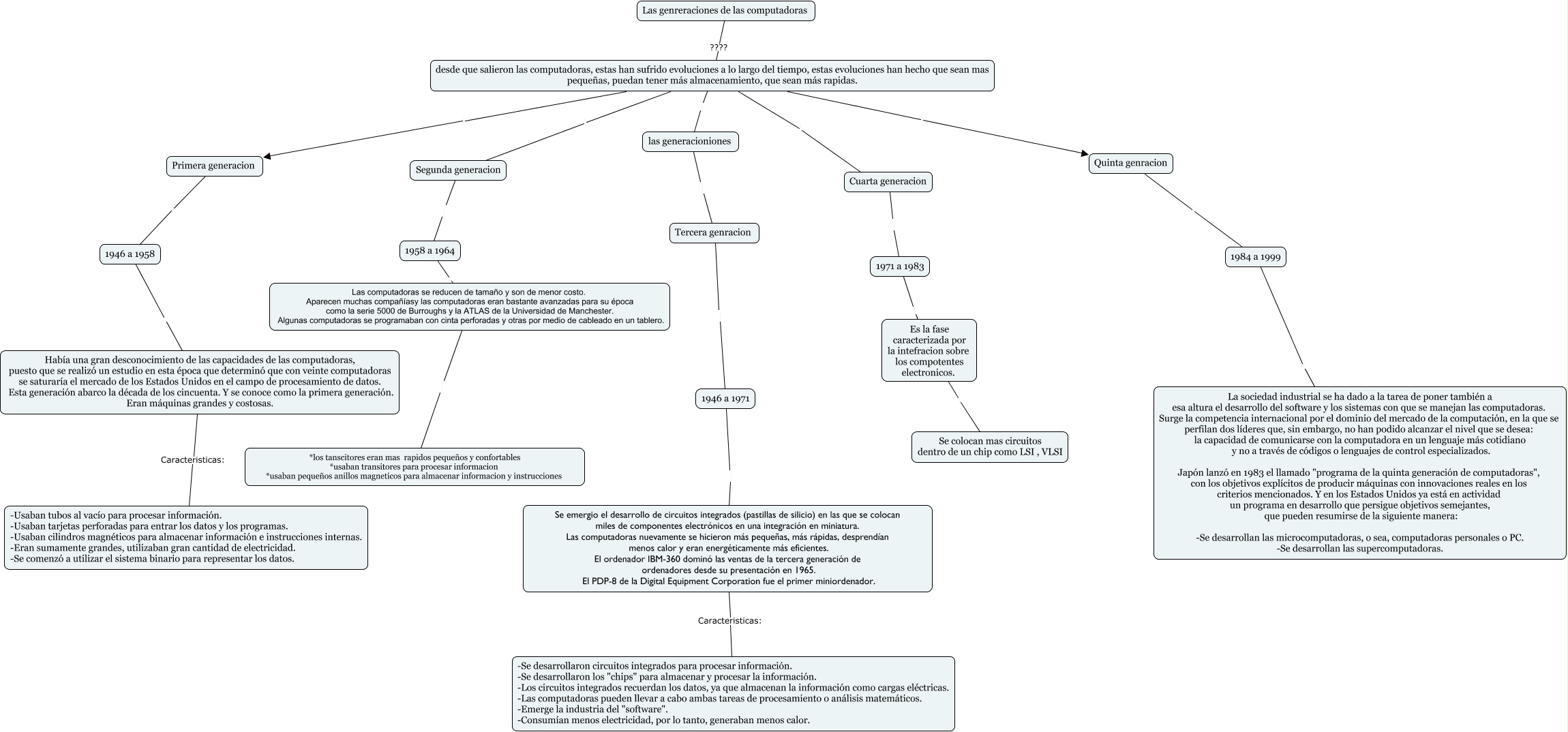 Este Cmap, tiene información relacionada con: GENERACIONES DE LAS COMPUTADORAS, Segunda generacion 1958 a 1964, Se emergio el desarrollo de circuitos integrados (pastillas de silicio) en las que se colocan miles de componentes electrónicos en una integración en miniatura. Las computadoras nuevamente se hicieron más pequeñas, más rápidas, desprendían menos calor y eran energéticamente más eficientes. El ordenador IBM-360 dominó las ventas de la tercera generación de ordenadores desde su presentación en 1965. El PDP-8 de la Digital Equipment Corporation fue el primer miniordenador. Caracteristicas: -Se desarrollaron circuitos integrados para procesar información. -Se desarrollaron los "chips" para almacenar y procesar la información. -Los circuitos integrados recuerdan los datos, ya que almacenan la información como cargas eléctricas. -Las computadoras pueden llevar a cabo ambas tareas de procesamiento o análisis matemáticos. -Emerge la industria del "software". -Consumían menos electricidad, por lo tanto, generaban menos calor., Las genreraciones de las computadoras ???? desde que salieron las computadoras, estas han sufrido evoluciones a lo largo del tiempo, estas evoluciones han hecho que sean mas pequeñas, puedan tener más almacenamiento, que sean más rapidas., 1958 a 1964 Las computadoras se reducen de tamaño y son de menor costo. Aparecen muchas compañíasy las computadoras eran bastante avanzadas para su época como la serie 5000 de Burroughs y la ATLAS de la Universidad de Manchester. Algunas computadoras se programaban con cinta perforadas y otras por medio de cableado en un tablero., Primera generacion 1946 a 1958, desde que salieron las computadoras, estas han sufrido evoluciones a lo largo del tiempo, estas evoluciones han hecho que sean mas pequeñas, puedan tener más almacenamiento, que sean más rapidas. Cuarta generacion, 1971 a 1983 Es la fase caracterizada por la intefracion sobre los compotentes electronicos., 1946 a 1958 Había una gran desconocimiento de las capacidades de las computadoras, puesto que se realizó un estudio en esta época que determinó que con veinte computadoras se saturaría el mercado de los Estados Unidos en el campo de procesamiento de datos. Esta generación abarco la década de los cincuenta. Y se conoce como la primera generación. Eran máquinas grandes y costosas., 1946 a 1971 Se emergio el desarrollo de circuitos integrados (pastillas de silicio) en las que se colocan miles de componentes electrónicos en una integración en miniatura. Las computadoras nuevamente se hicieron más pequeñas, más rápidas, desprendían menos calor y eran energéticamente más eficientes. El ordenador IBM-360 dominó las ventas de la tercera generación de ordenadores desde su presentación en 1965. El PDP-8 de la Digital Equipment Corporation fue el primer miniordenador., Las computadoras se reducen de tamaño y son de menor costo. Aparecen muchas compañíasy las computadoras eran bastante avanzadas para su época como la serie 5000 de Burroughs y la ATLAS de la Universidad de Manchester. Algunas computadoras se programaban con cinta perforadas y otras por medio de cableado en un tablero. *los tanscitores eran mas rapidos pequeños y confortables *usaban transitores para procesar informacion *usaban pequeños anillos magneticos para almacenar informacion y instrucciones, 1984 a 1999 La sociedad industrial se ha dado a la tarea de poner también a esa altura el desarrollo del software y los sistemas con que se manejan las computadoras. Surge la competencia internacional por el dominio del mercado de la computación, en la que se perfilan dos líderes que, sin embargo, no han podido alcanzar el nivel que se desea: la capacidad de comunicarse con la computadora en un lenguaje más cotidiano y no a través de códigos o lenguajes de control especializados. Japón lanzó en 1983 el llamado "programa de la quinta generación de computadoras", con los objetivos explícitos de producir máquinas con innovaciones reales en los criterios mencionados. Y en los Estados Unidos ya está en actividad un programa en desarrollo que persigue objetivos semejantes, que pueden resumirse de la siguiente manera: -Se desarrollan las microcomputadoras, o sea, computadoras personales o PC. -Se desarrollan las supercomputadoras., desde que salieron las computadoras, estas han sufrido evoluciones a lo largo del tiempo, estas evoluciones han hecho que sean mas pequeñas, puedan tener más almacenamiento, que sean más rapidas. las generacioniones, Quinta genracion 1984 a 1999, Es la fase caracterizada por la intefracion sobre los compotentes electronicos. Se colocan mas circuitos dentro de un chip como LSI , VLSI, Había una gran desconocimiento de las capacidades de las computadoras, puesto que se realizó un estudio en esta época que determinó que con veinte computadoras se saturaría el mercado de los Estados Unidos en el campo de procesamiento de datos. Esta generación abarco la década de los cincuenta. Y se conoce como la primera generación. Eran máquinas grandes y costosas. Caracteristicas: -Usaban tubos al vacío para procesar información. -Usaban tarjetas perforadas para entrar los datos y los programas. -Usaban cilindros magnéticos para almacenar información e instrucciones internas. -Eran sumamente grandes, utilizaban gran cantidad de electricidad. -Se comenzó a utilizar el sistema binario para representar los datos., desde que salieron las computadoras, estas han sufrido evoluciones a lo largo del tiempo, estas evoluciones han hecho que sean mas pequeñas, puedan tener más almacenamiento, que sean más rapidas. Primera generacion, las generacioniones Tercera genracion, desde que salieron las computadoras, estas han sufrido evoluciones a lo largo del tiempo, estas evoluciones han hecho que sean mas pequeñas, puedan tener más almacenamiento, que sean más rapidas. Segunda generacion, Cuarta generacion 1971 a 1983, Tercera genracion 1946 a