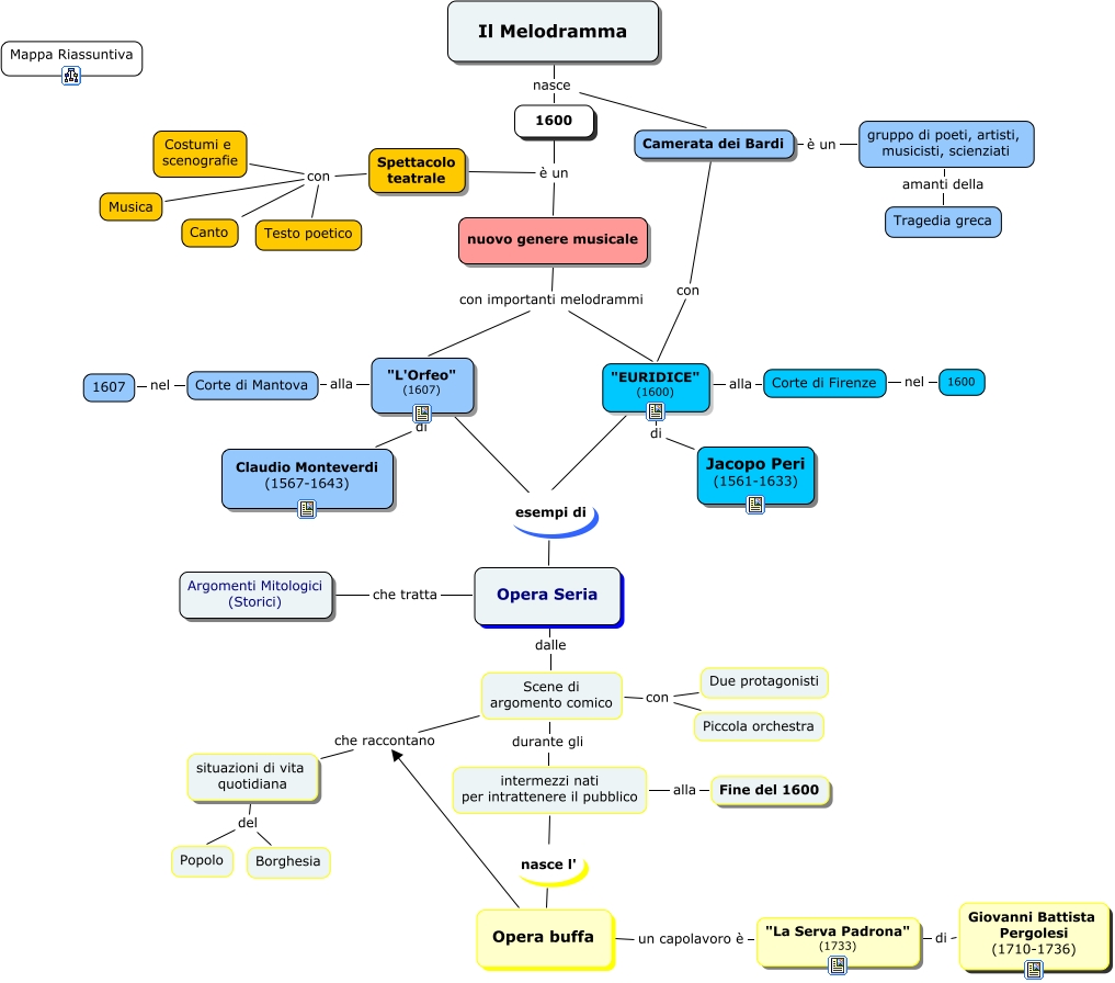 Questa Cmap, creata con IHMC CmapTools, contiene informazioni relative a: L10P1 Il Melodramma, gruppo di poeti, artisti, musicisti, scienziati amanti della Tragedia greca, Camerata dei Bardi con "EURIDICE" (1600), intermezzi nati per intrattenere il pubblico alla Fine del 1600, Opera Seria che tratta Argomenti Mitologici (Storici), "L'Orfeo" (1607) alla Corte di Mantova, Scene di argomento comico con Due protagonisti, "La Serva Padrona" (1733) di Giovanni Battista Pergolesi (1710-1736), Spettacolo teatrale con Testo poetico, intermezzi nati per intrattenere il pubblico nasce l' Opera buffa, situazioni di vita quotidiana del Borghesia, nuovo genere musicale con importanti melodrammi "EURIDICE" (1600), Spettacolo teatrale con Costumi e scenografie, Il Melodramma nasce Camerata dei Bardi, Corte di Mantova nel 1607, "EURIDICE" (1600) alla Corte di Firenze, Opera Seria dalle Scene di argomento comico, "L'Orfeo" (1607) esempi di Opera Seria, Corte di Firenze nel 1600, nuovo genere musicale con importanti melodrammi "L'Orfeo" (1607), "EURIDICE" (1600) di Jacopo Peri (1561-1633)