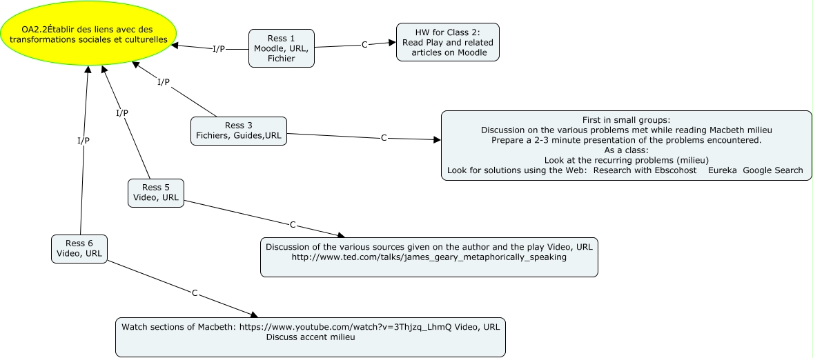 Cette carte de concepts créée avec IHMC CmapTools traite de: OA2.2 Travail 3, Ress 5 Video, URL C Discussion of the various sources given on the author and the play Video, URL http://www.ted.com/talks/james_geary_metaphorically_speaking, Ress 3 Fichiers, Guides,URL I/P OA2.2Établir des liens avec des transformations sociales et culturelles, Ress 1 Moodle, URL, Fichier C HW for Class 2: Read Play and related articles on Moodle, Ress 6 Video, URL C Watch sections of Macbeth: https://www.youtube.com/watch?v=3Thjzq_LhmQ Video, URL Discuss accent milieu, Ress 5 Video, URL I/P OA2.2Établir des liens avec des transformations sociales et culturelles, Ress 1 Moodle, URL, Fichier I/P OA2.2Établir des liens avec des transformations sociales et culturelles, Ress 6 Video, URL I/P OA2.2Établir des liens avec des transformations sociales et culturelles, Ress 3 Fichiers, Guides,URL C First in small groups: Discussion on the various problems met while reading Macbeth milieu Prepare a 2-3 minute presentation of the problems encountered. As a class: Look at the recurring problems (milieu) Look for solutions using the Web: Research with Ebscohost Eureka Google Search